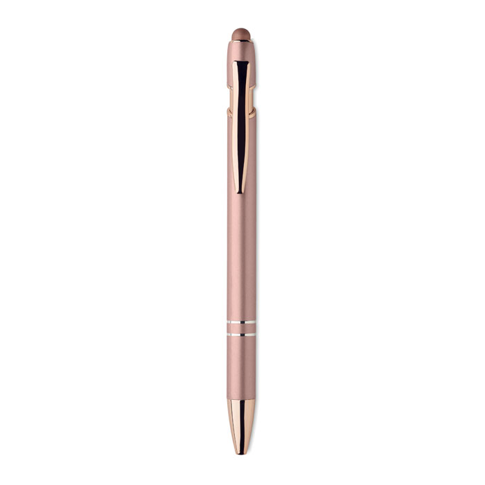Druckkugelschreiber mit Stylus aus recyceltem Aluminium mit rosé goldenen Details. Blaue Tinte.