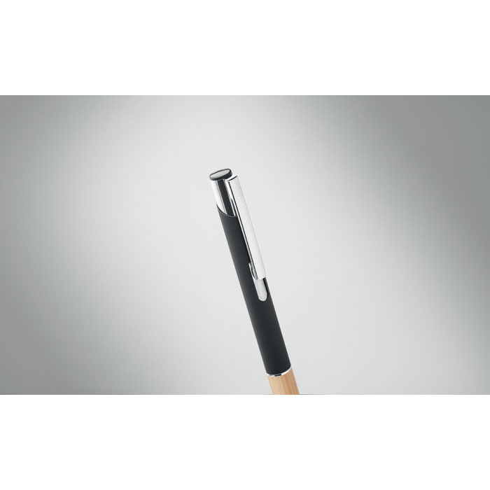 Druckkugelschreiber. Aluminium mit Griffteil aus Bambus. Blaue Tinte.