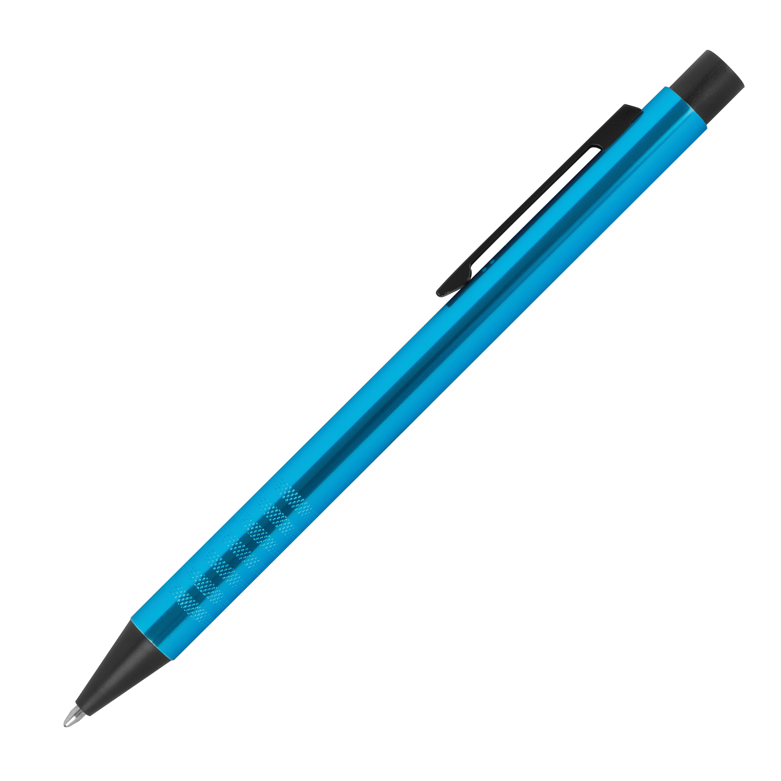 Druckkugelschreiber aus Metall mit blau schreibender Mine und extravaganter Griffzone. Ihre Werbung wird rechts vom Clip per Lasergravur angebracht.