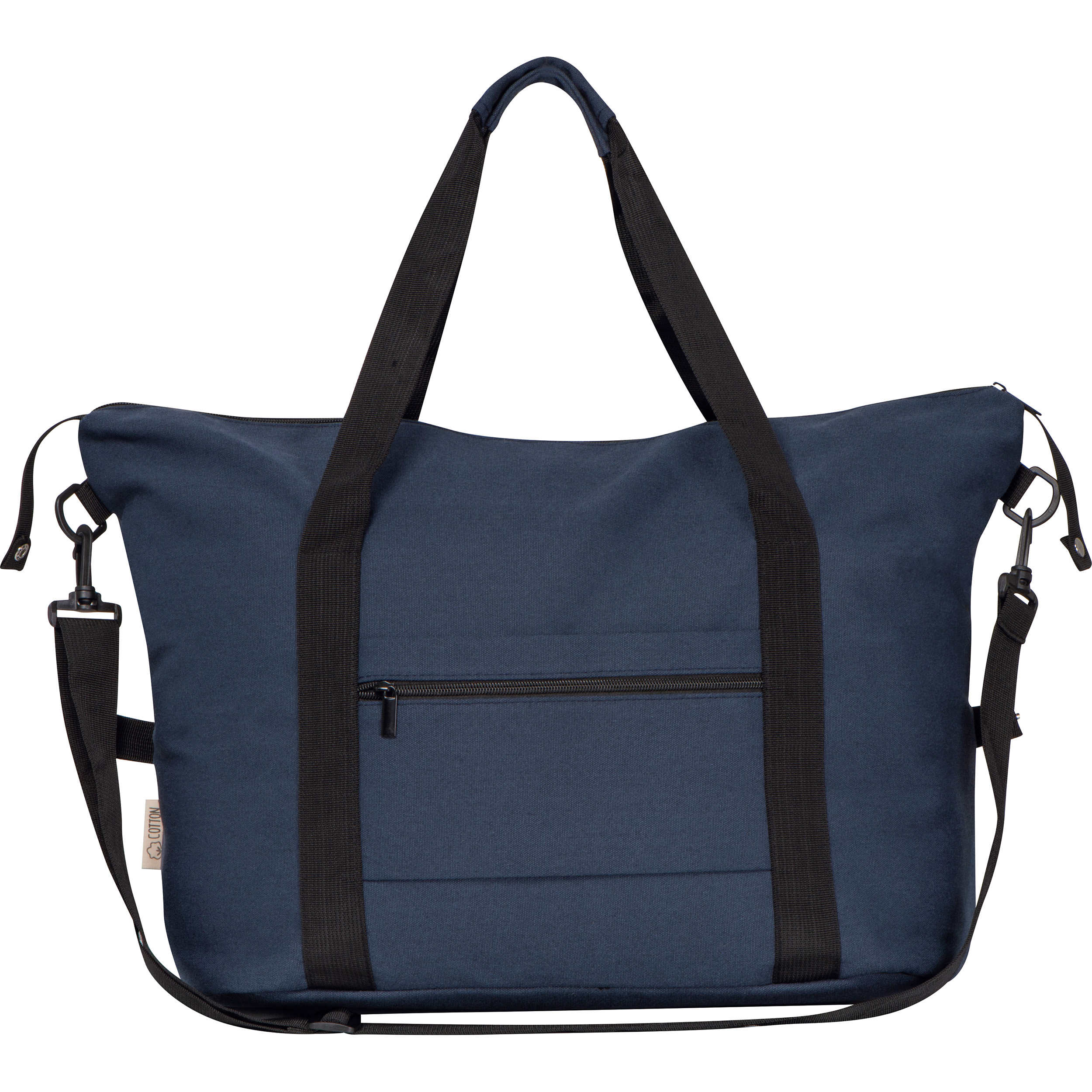 Die Duffel Bag aus recycelter Baumwolle bietet viel Stauraum und ist perfekt für kurze Reisen und Sport geeignet. Der verstellbare Schultergurt ist mit Karabinerhaken befestigt. Ihre Werbung drucken wir auf das Vorfach.
