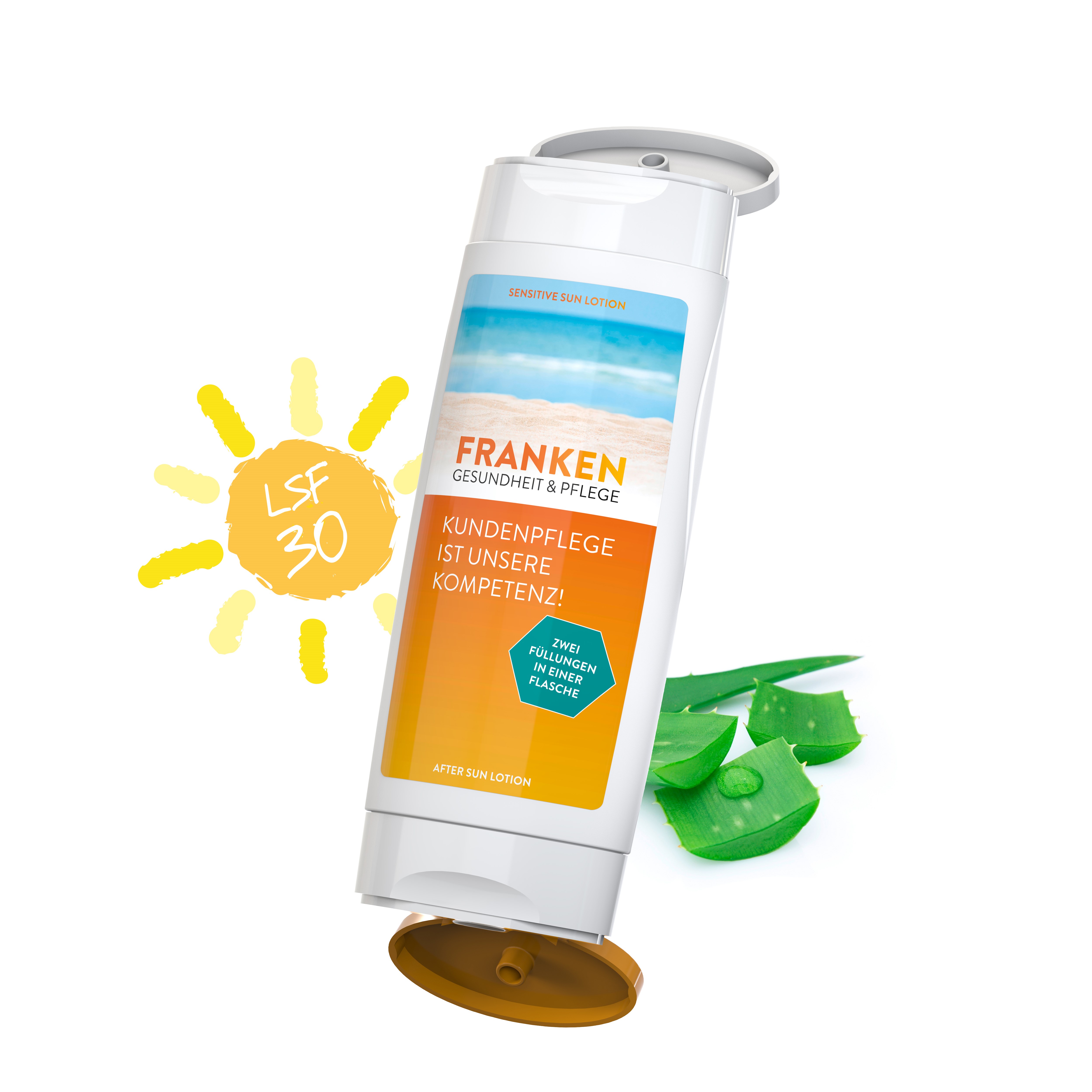 DuoPack 2 x 50 ml: Neue, raffinierte und enorm werbewirksame Flasche mit zwei Füllungen. Füllung oben: Sonnencreme (Sensitiv, parfümfrei ohne Duftstoffe) - LSF 30 (Hohes Schutzniveau). • UVA- / UVB-Breitbandfilter. • Wasserfest, 24h Langzeitfeuchtigkeit • mit Vitamin E und Glycerin • Ohne Octocrylene, Nanofrei, vegan • Kein Mikroplastik • Keine Parabene, Mineralöle, Silikone • Korallenfreundlich gemäß Hawaii-Riffgesetz Im DuoPack ideal kombiniert mit der sensitiven After Sun Lotion ohne Duftstoffe. Beruhigende, intensive Feuchtigkeitspflege für sonnengereizte Haut. • Ausgewogene Pflegeformel • mit Glycerin, Jojobaöl, Panthenol und Vitamin E • Unterstützt den Feuchtigkeitshaushalt der Haut. Zieht schnell ein und verleiht ein geschmeidiges, samtweiches Hautgefühl. Beide Füllungen sind dermatologisch von einem unabhängigen Institut "Sehr gut hautverträglich" bewertet. Hergestellt in Deutschland. Dekoration: Body Label (PP weiß): Hochglänzendes Etikett auf Vorder- und Rückseite des DuoPack, Druck: 4c. Wählen Sie außerdem aus 6 Kappenfarben für oben und unten! Farben: weiß, schwarz, rot, blau, grün, gelborange.