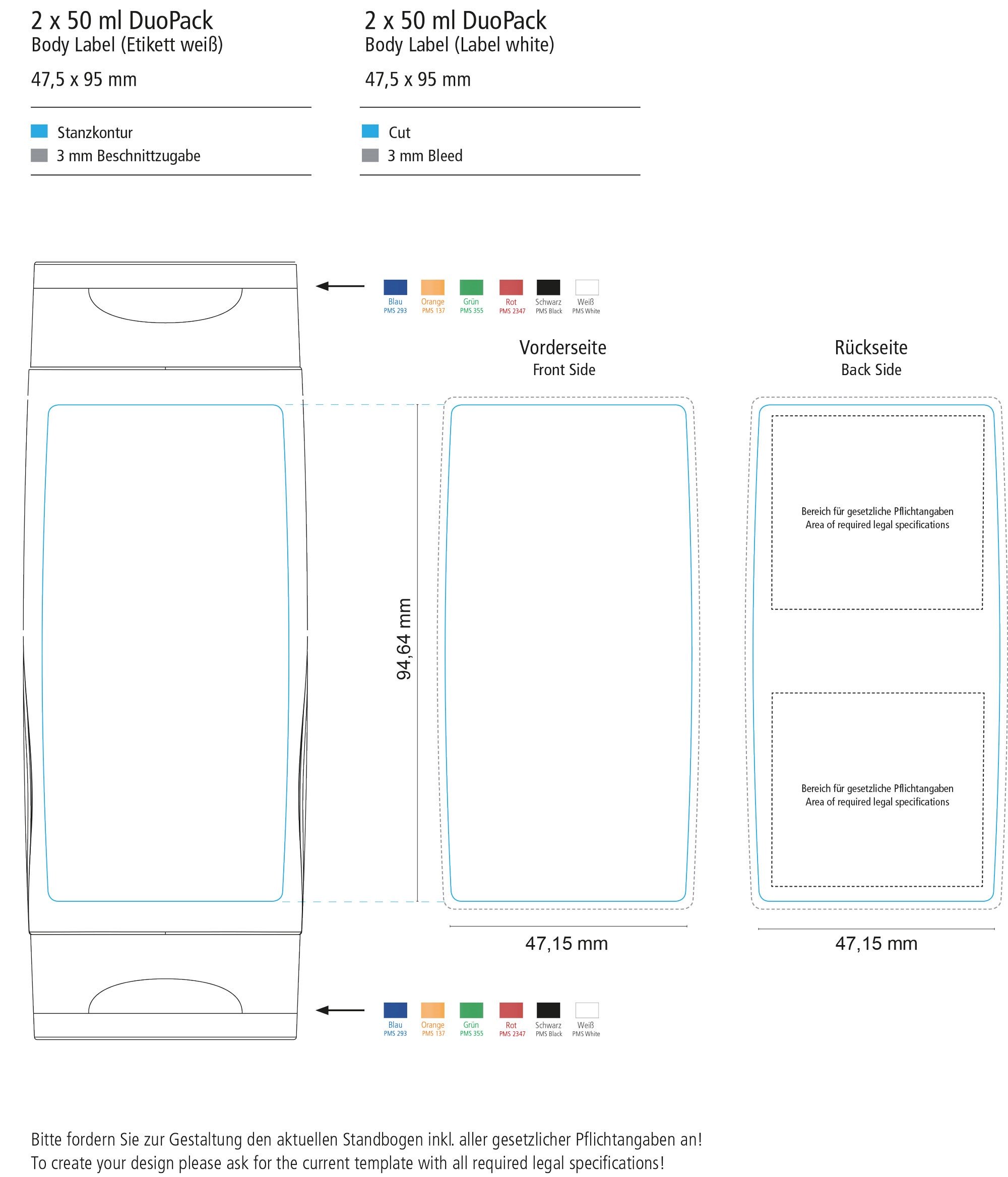 DuoPack 2 x 50 ml: Neue, raffinierte und enorm werbewirksame Flasche mit zwei Füllungen. Füllung oben: Sonnencreme (Sensitiv, parfümfrei ohne Duftstoffe) - LSF 50 (Hohes Schutzniveau). • UVA- / UVB-Breitbandfilter. • Wasserfest, 24h Langzeitfeuchtigkeit • mit Vitamin E und Glycerin • Ohne Octocrylene, Vegan • Kein Mikroplastik • Keine Parabene, Mineralöle, Silikone • Korallenfreundlich gemäß Hawaii-Riffgesetz Im DuoPack ideal kombiniert mit Hände-Desinfektionsgel. Breites Wirkspektrum gegen Viren, Bakterien und Hefen. Es eignet sich für eine hygienische Händedesinfektion gemäß DIN EN 1500 bei einer Anwendung von nur 30 Sekunden. Spezielle Pflegekomponenten schonen die Haut auch bei häufigerer Anwendung und halten sie geschmeidig. Wirksamkeit bestätigt gemäß DIN EN 1500, 13727, 13624, 14476. Enthält pro 100 g als Wirkstoff: Ethanol (50 g/100 g), Isopropanol (25 g/100 g). Biozide sicher verwenden. Vor Gebrauch Etikett und Produktinformation lesen. Reg. Nr. UFI 1300-P0H0-7009-GENU; BAuA Reg. Nr.: N-100780 Keine Lieferung in die Schweiz möglich. Beide Füllungen sind dermatologisch von einem unabhängigen Institut getestet und mit dem Ergebnis "Sehr gut hautverträglich" bewertet. Hergestellt in Deutschland. Dekoration Body Label (PP weiß): Hochglänzendes Etikett auf Vorder- und Rückseite des DuoPack, Druck: 4c. Wählen Sie außerdem aus 6 Kappenfarben für oben und unten! Farben: weiß, schwarz, rot, blau, grün, gelborange.