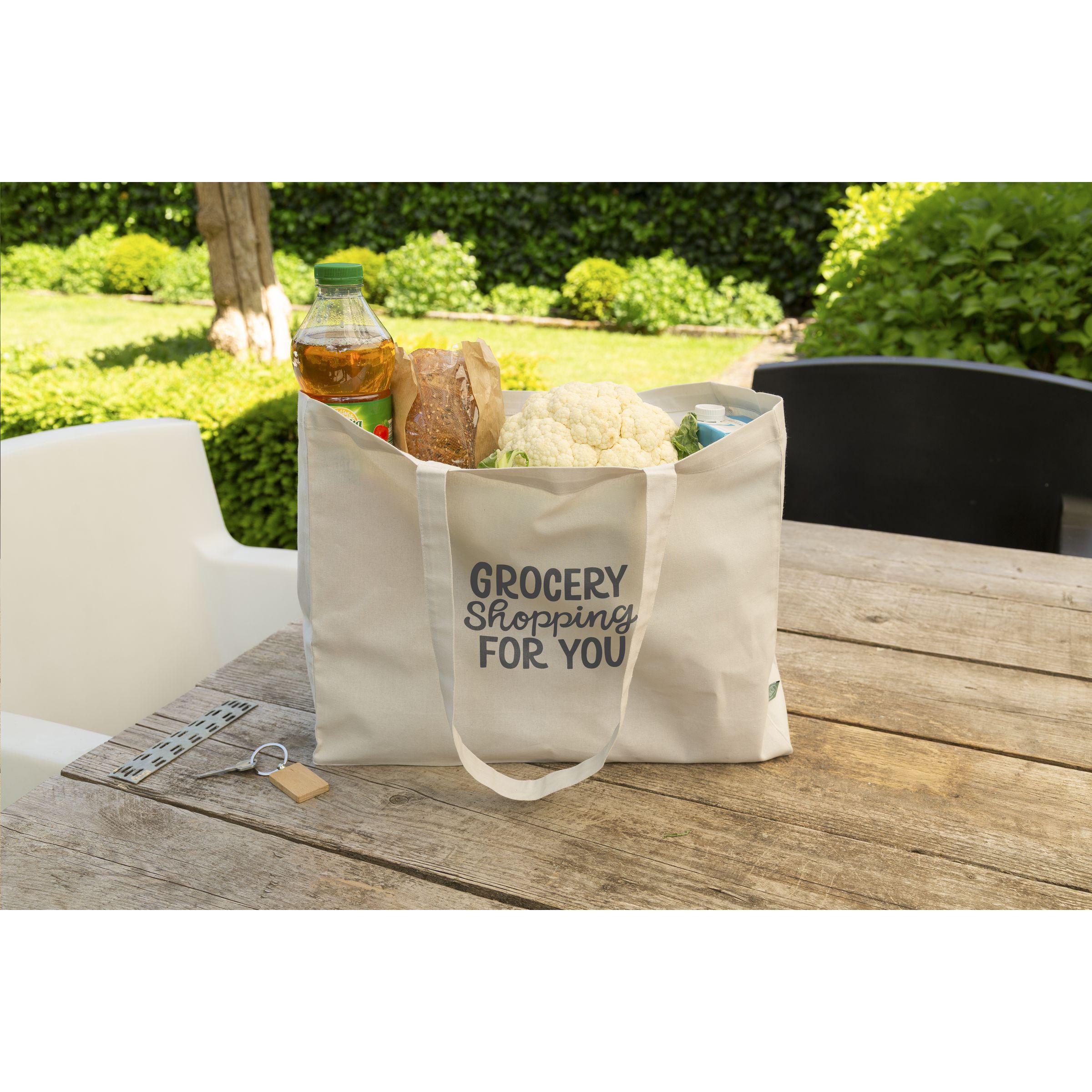 Robuste Einkaufstasche aus 100% Baumwolle in Bio-Qualität (180 g/m²). Mit langen Griffen. Ideal für die häufige Wiederverwendung. Fassungsvermögen ca. 19 Liter.