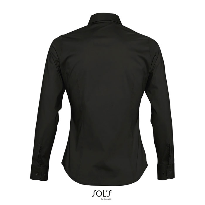 SOL'S EDEN Damen Shirt 140g. Aus Elasthan-Baumwolle. Der körpernahe Schnitt sorgt für Halt und Bequemlichkeit. Fashion-Produkt. Figurbetonter Schnitt. Langarm. 1-Knopf-Kragen. Verstellbare 2-Knöpfe-Ärmelbündchen mit Aufschlag im Kapuzinerstil. Leiste mit 7 Knöpfen in harmonierendem Farbton. Abnäher vorn und hinten. Material: 97% Baumwolle - 3% Elasthan. OEKO-TEX®. Verkauf nur inklusive Werbeanbringung.