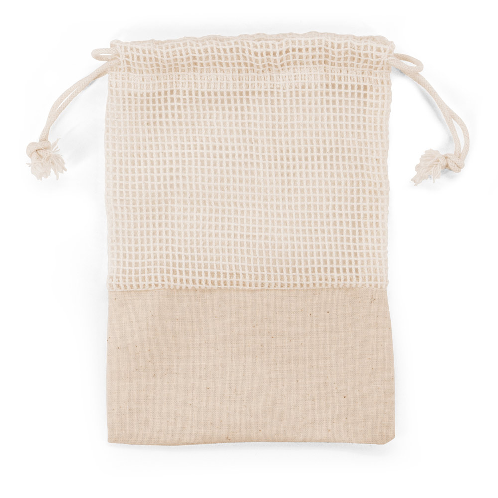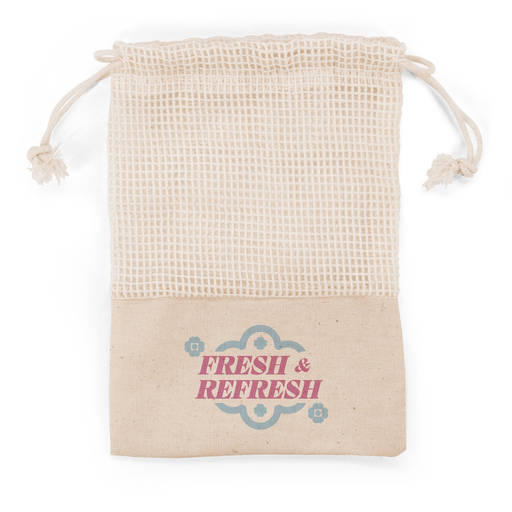 Set mit 3 waschbaren und wiederverwendbaren Gesichtsreinigungspads aus einer luxuriösen Mischung aus Bambusfasern (40%), Polyester (10%), Baumwolle (47.5%) und Elasthan (2.5%). Verpackt in einem weichen Beutel aus natürlicher Baumwolle, der auch zum Waschen verwendet werden kann. Eine praktische und nachhaltige Wahl für Ihre Hautpflege. 121 x 150 mm