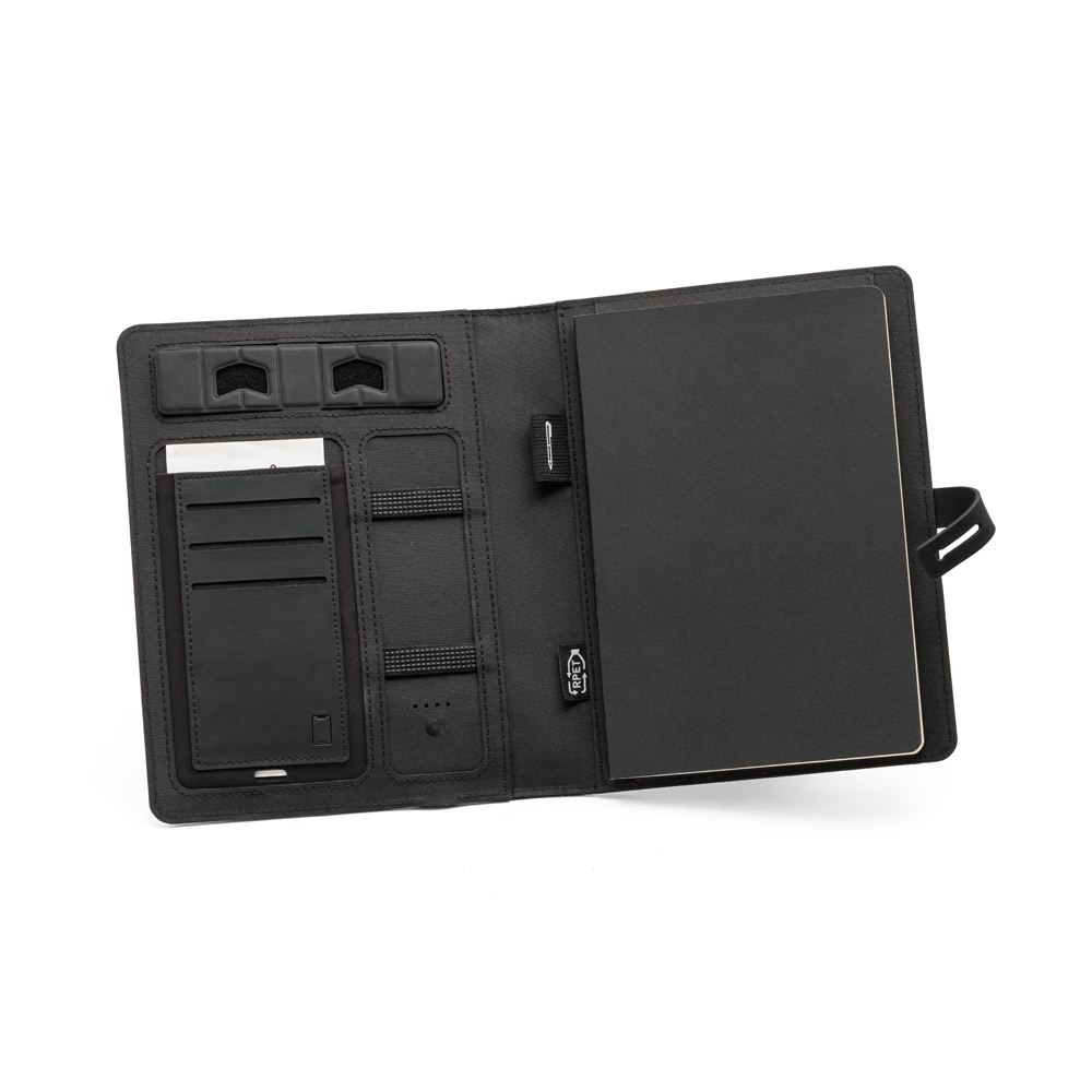 Schreibmappe A5 aus 300D recyceltem Polyester (100% rPET) mit einem integriertem kabellosen Ladegerät. Dieses hat eine Akku-Kapazität von 5'000 mAh, eine Ladeleistung von 10W und verfügt über einen Eingang / Ausgang 5V/2'1A. Enthält einen Typ C USB Ladekabel. Die Mappe beinhaltet ein Fach für einen Smartphone bis zu 6.5", drei Kartenfächer, vier LED Leuchten, einen Knopf on / off, Halter für Kugelschreiber (nicht enthalten), Smartphone und USB Kabel, einen Notizblock mit schwarzem Hardcover und 128 linierten Seiten (75 g / m²), wird aus FSC™-zertifiziertem Material und anderen kontrollierten Materialien hergestellt. Auf der Vorderseite der Schreibmappe ist ein ovales Symbol aufgedruckt, dieser zeigt die Ladefläche an. Geliefert in einer Schachtel. 165 x 225 x 25 mm