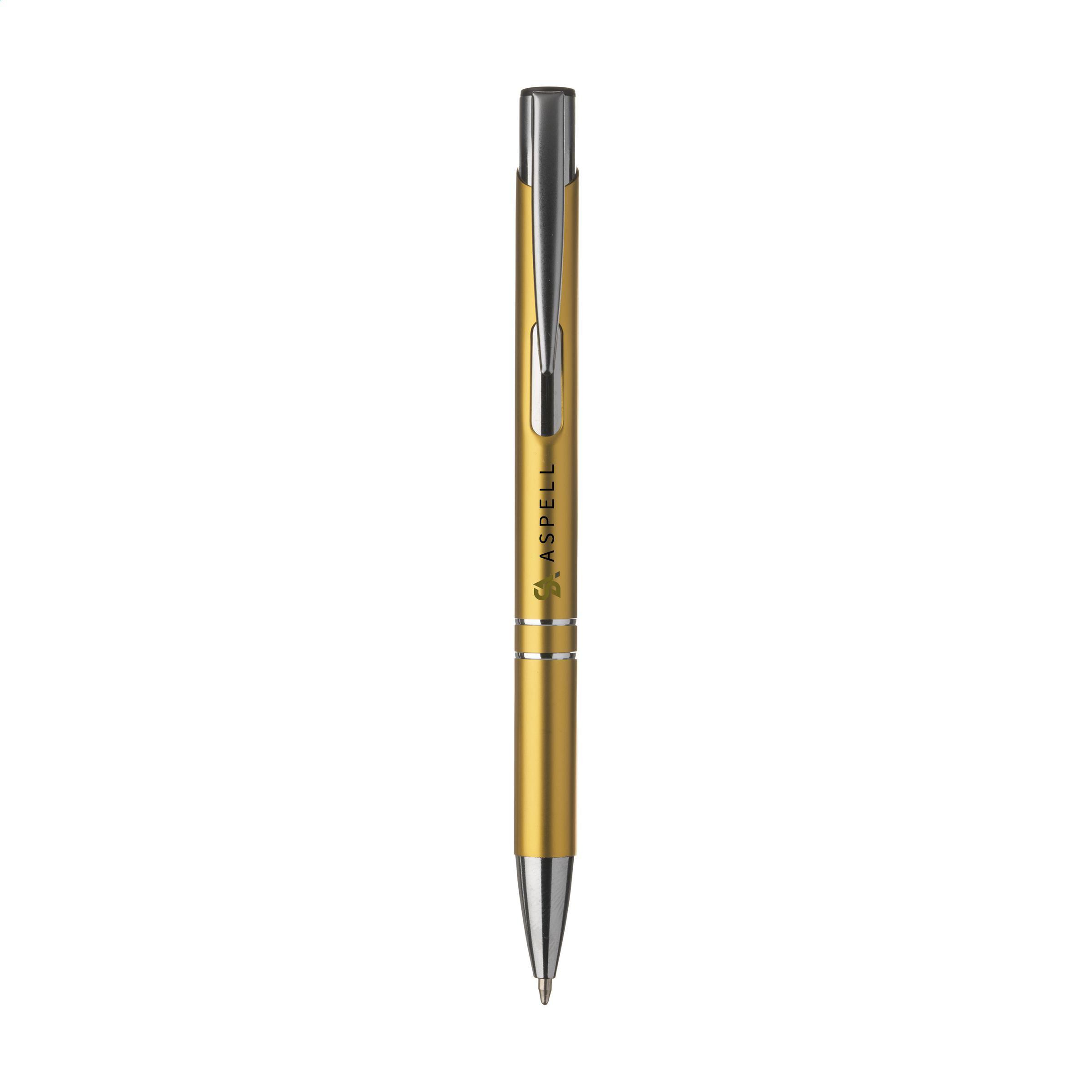 Beschreibung: Blauschreibender oder schwarzschreibender Kugelschreiber aus Aluminium mit mattfarbenem Gehäuse in Metalloptik und metallenem Clip/Druckknopf.