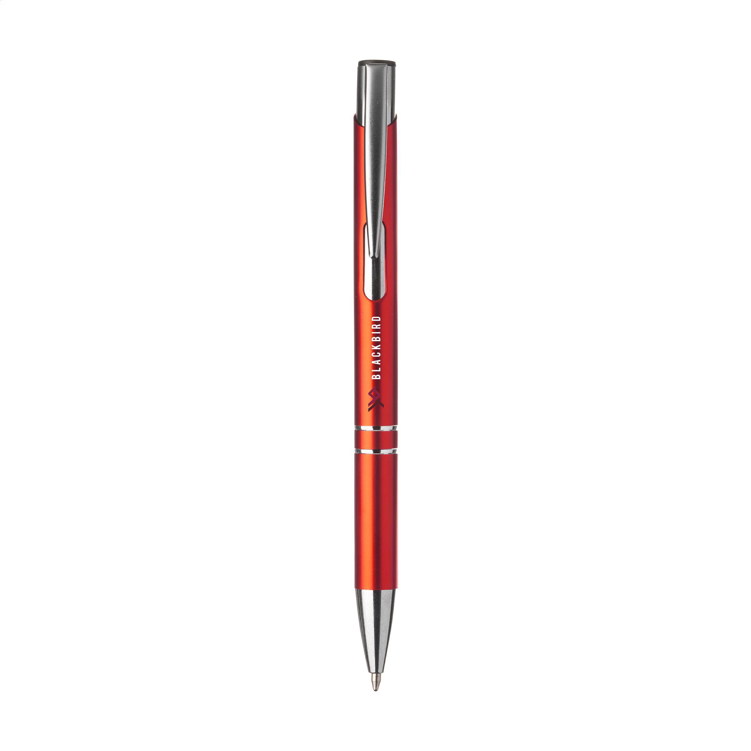 Beschreibung: Blauschreibender oder schwarzschreibender Kugelschreiber aus Aluminium mit mattfarbenem Gehäuse in Metalloptik und metallenem Clip/Druckknopf.
