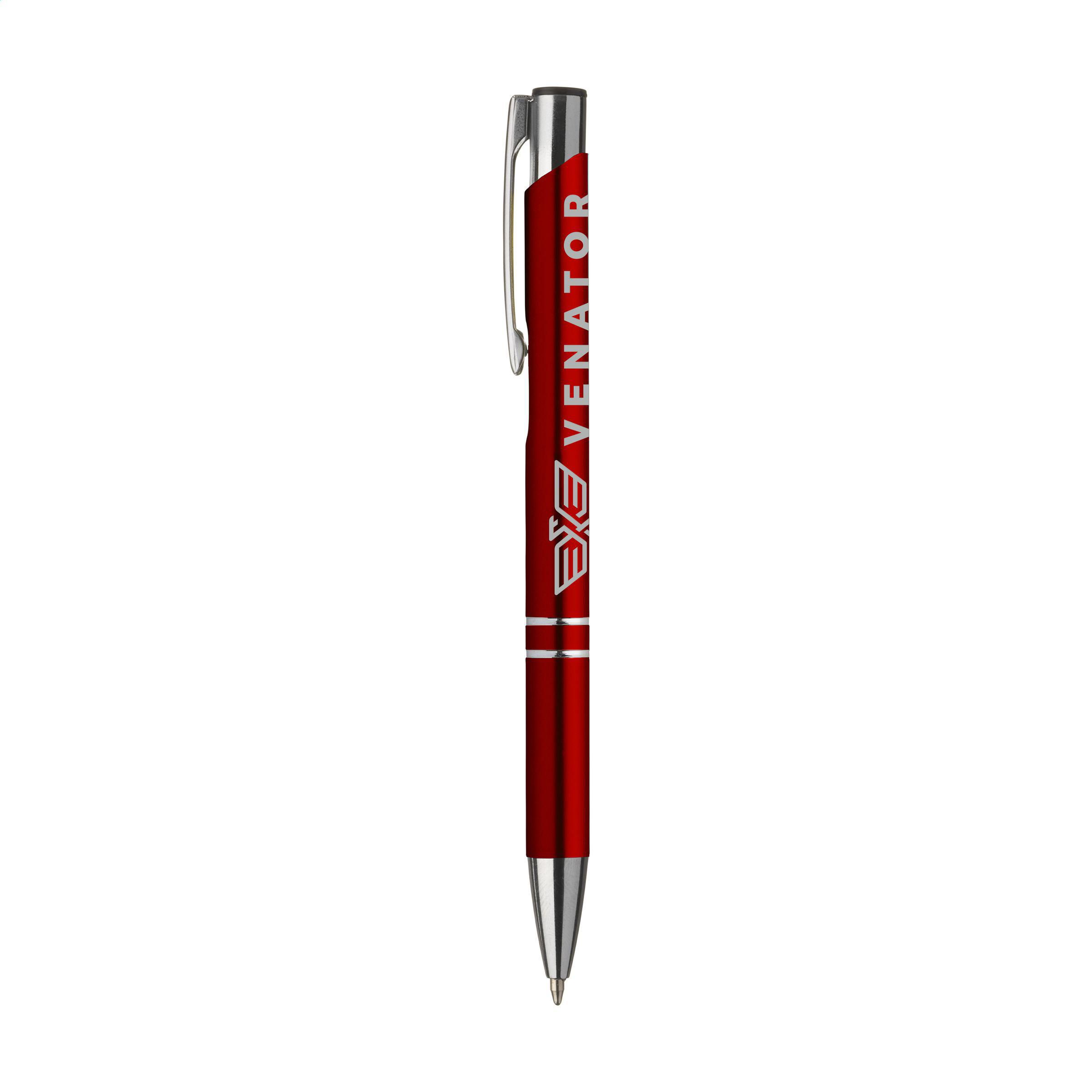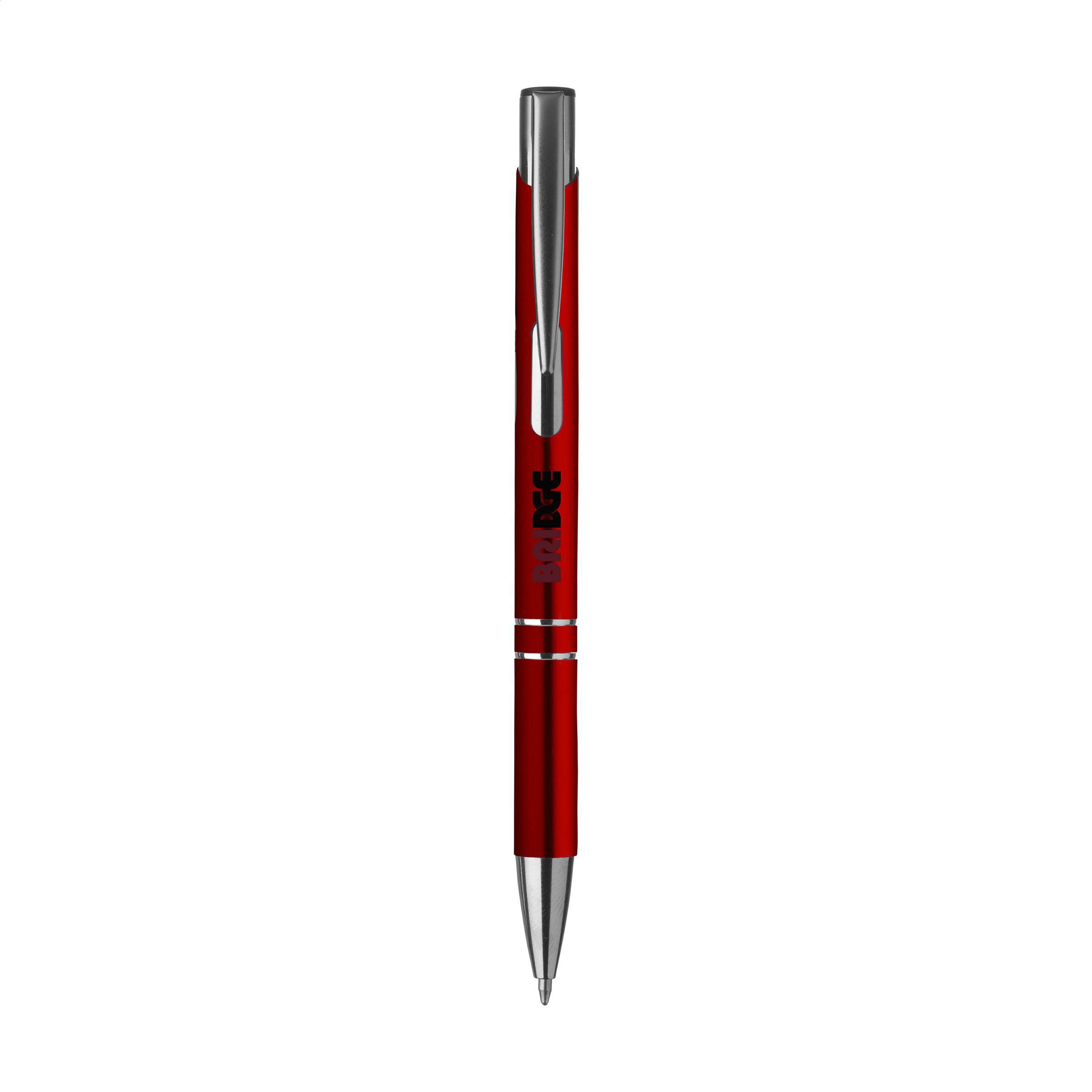 Beschreibung: Blauschreibender oder schwarzschreibender Kugelschreiber aus Aluminium mit mattfarbenem Gehäuse in Metalloptik und metallenem Clip/Druckknopf.