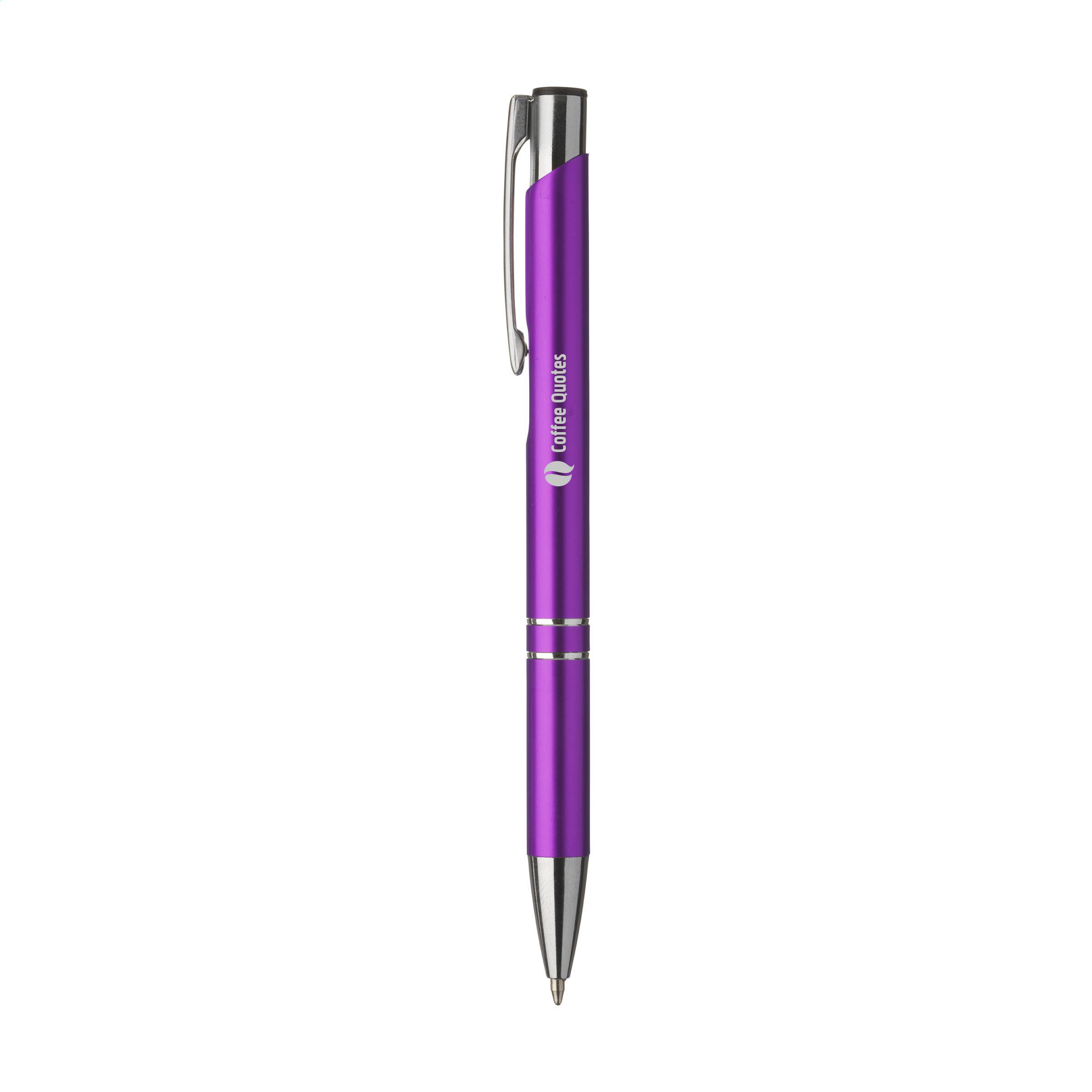 Beschreibung: Blauschreibender oder schwarzschreibender Kugelschreiber aus Aluminium mit mattfarbenem Gehäuse in Metalloptik und metallenem Clip/Druckknopf.