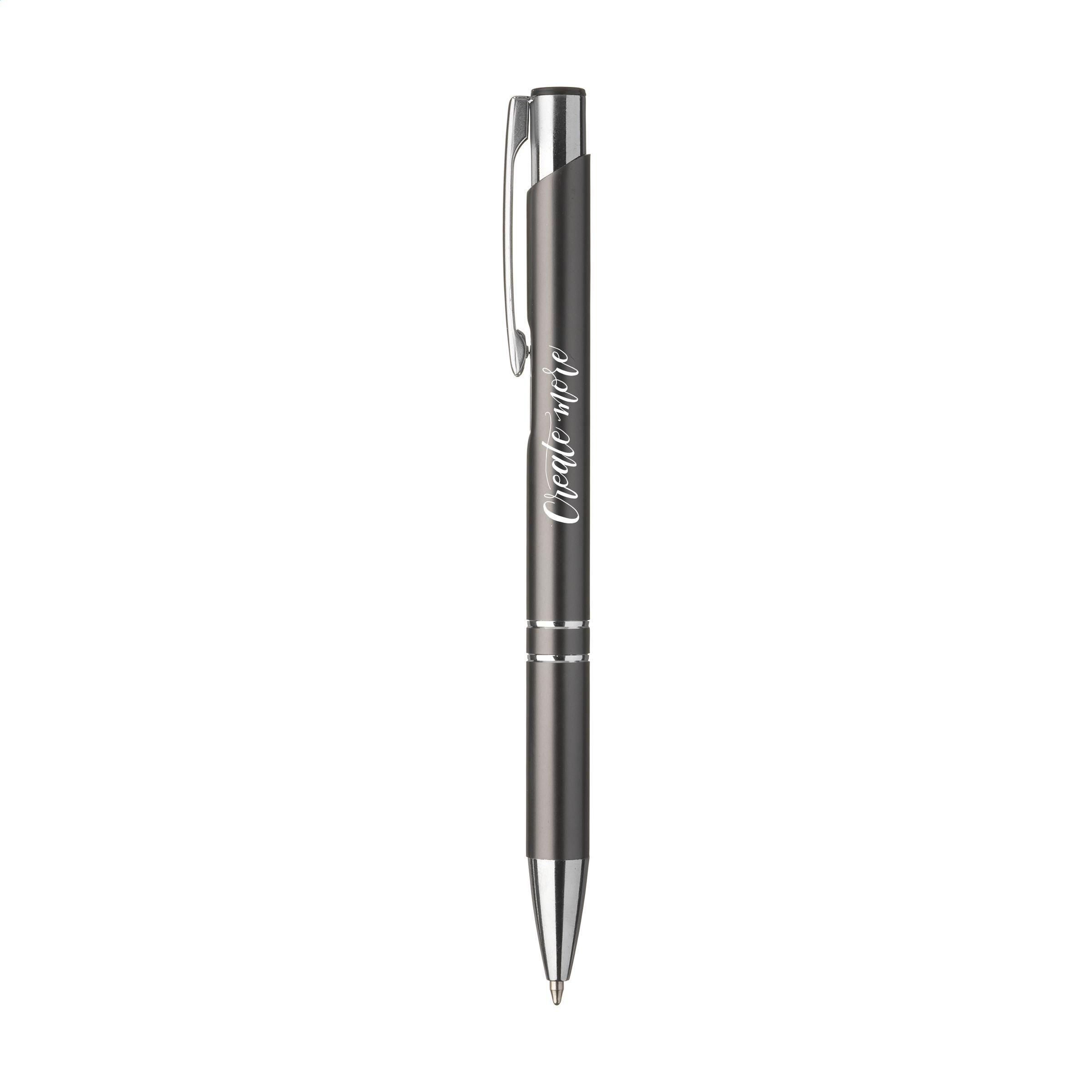 Beschreibung: Blauschreibender oder schwarzschreibender Kugelschreiber aus Aluminium mit mattfarbenem Gehäuse in Metalloptik und metallenem Clip/Druckknopf.