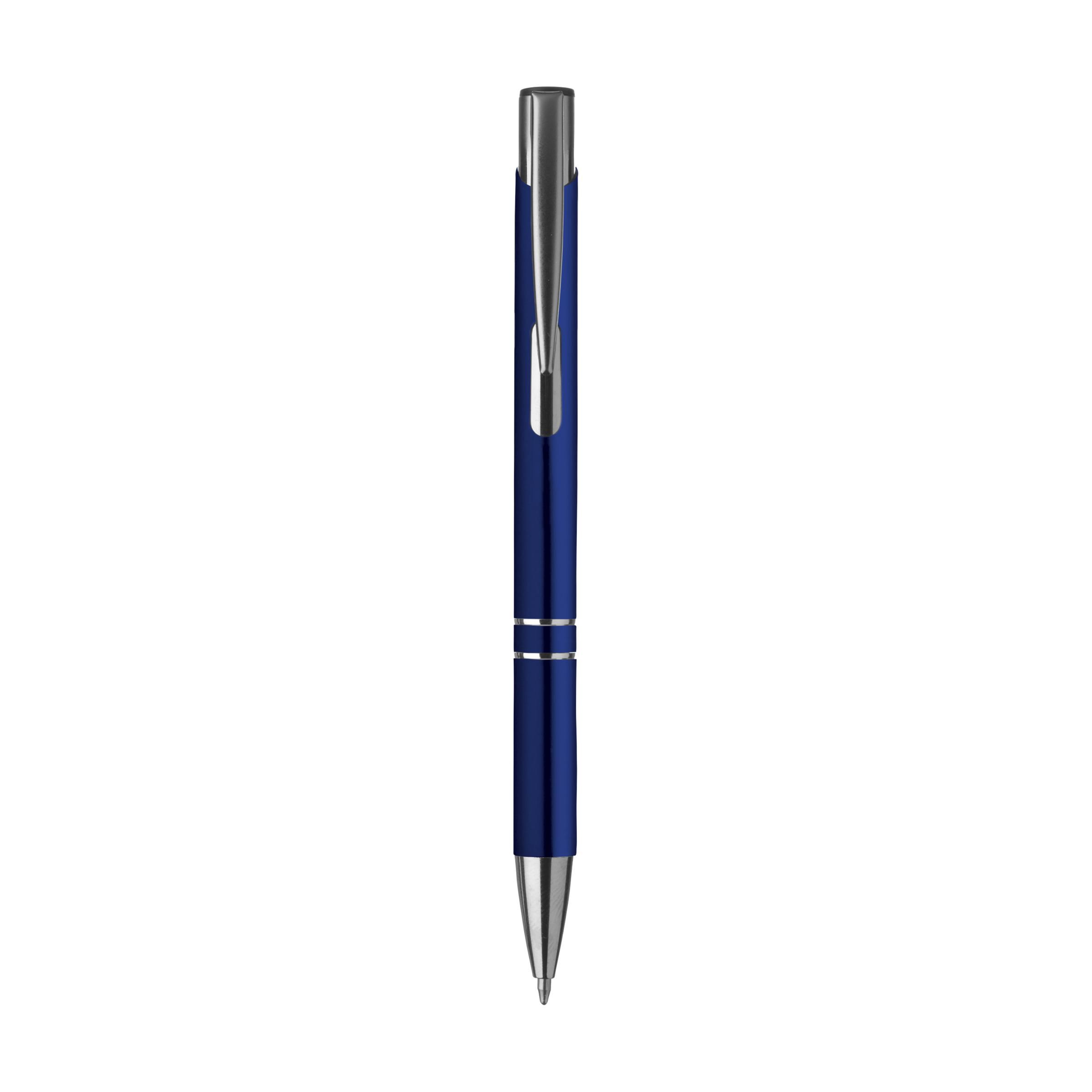 Beschreibung: Blauschreibender oder schwarzschreibender Kugelschreiber aus Aluminium mit mattfarbenem Gehäuse in Metalloptik und metallenem Clip / Druckknopf.