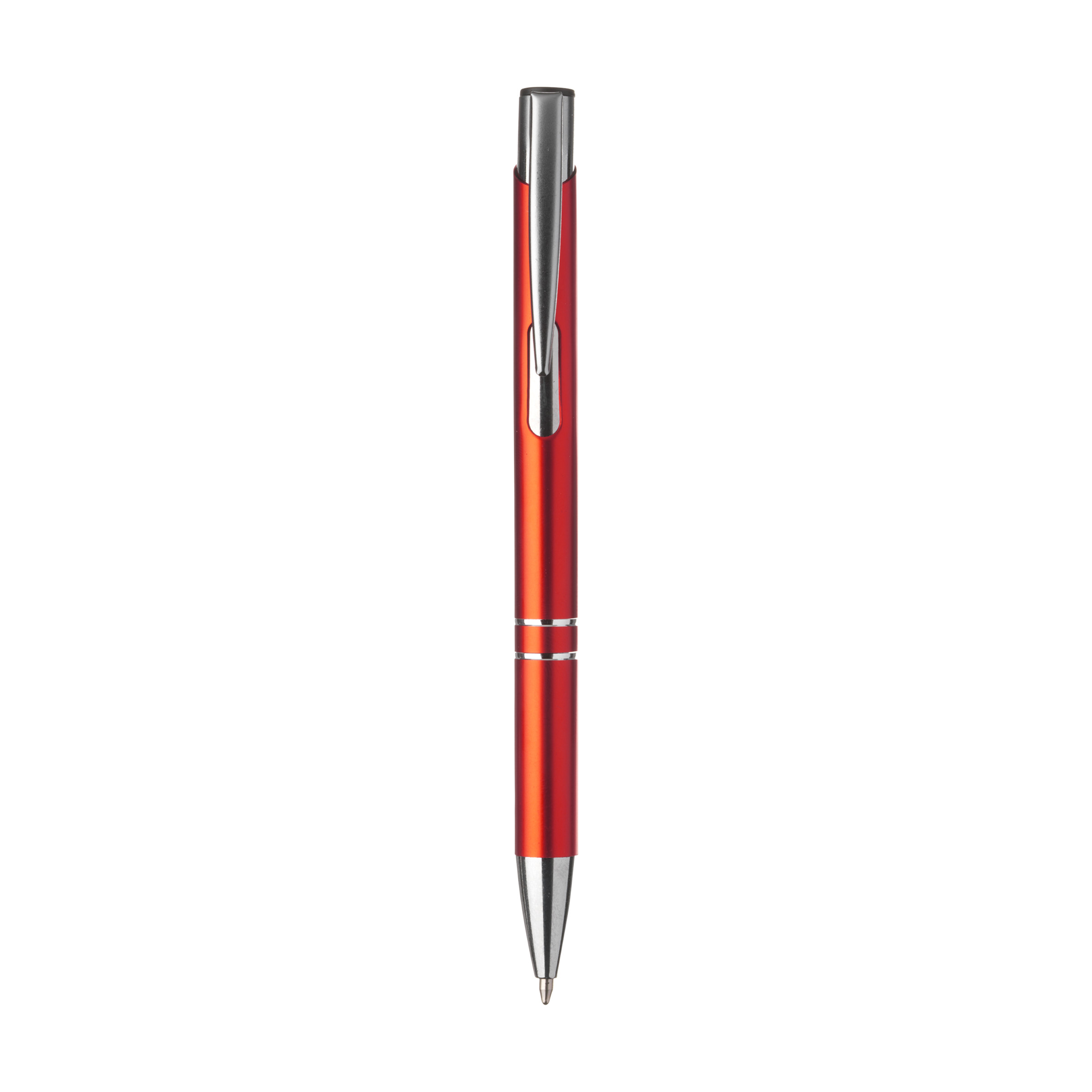 Beschreibung: Blauschreibender oder schwarzschreibender Kugelschreiber aus Aluminium mit mattfarbenem Gehäuse in Metalloptik und metallenem Clip / Druckknopf.