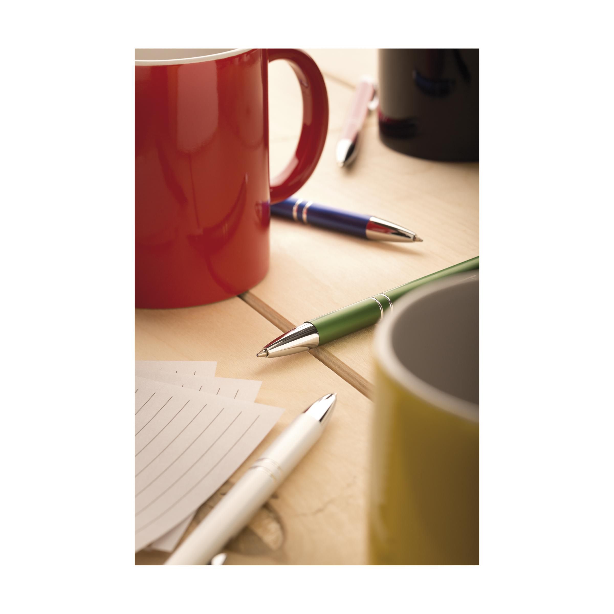 Beschreibung: Blauschreibender oder schwarzschreibender Kugelschreiber aus Aluminium mit mattfarbenem Gehäuse in Metalloptik und metallenem Clip / Druckknopf.
