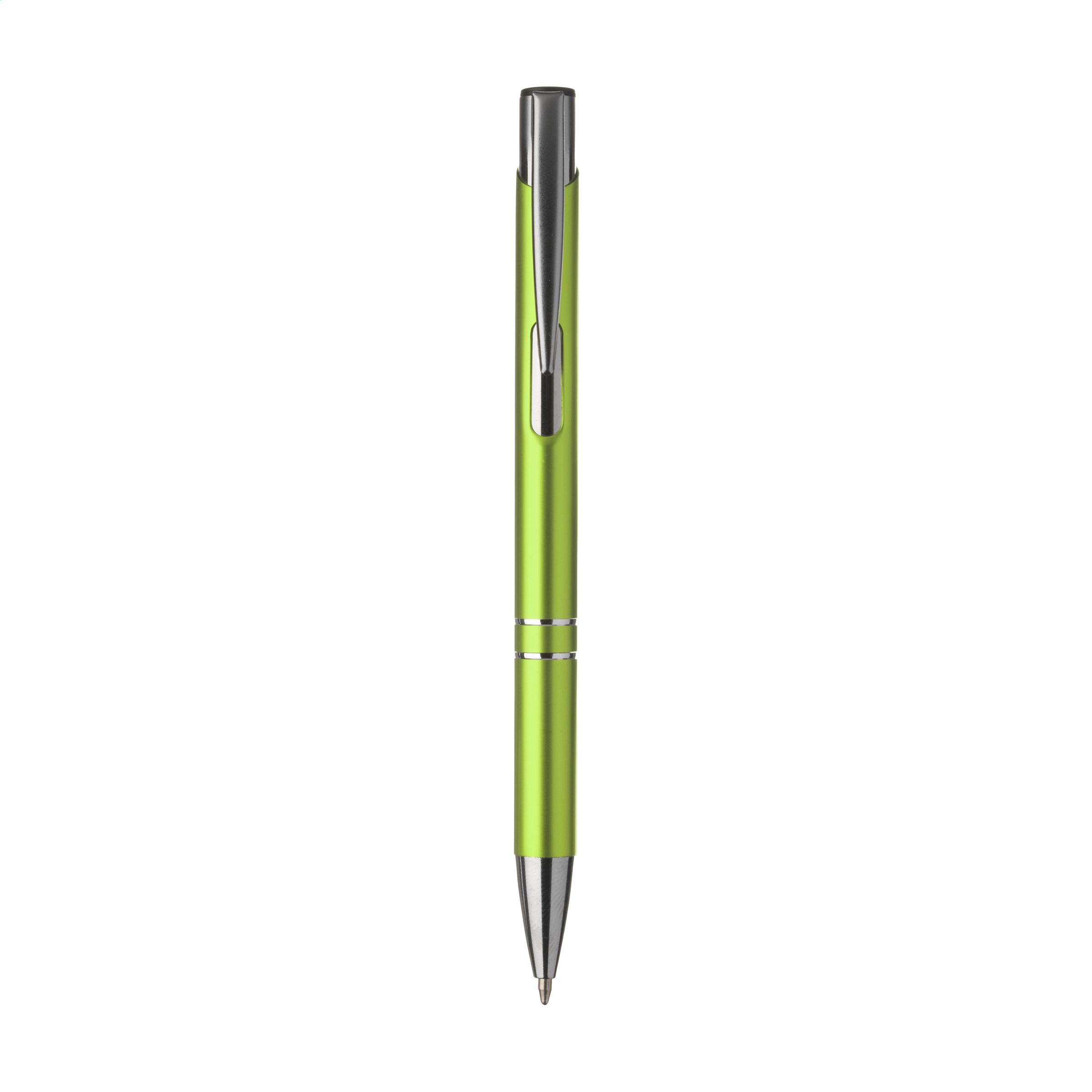 Beschreibung: Blauschreibender oder schwarzschreibender Kugelschreiber aus Aluminium mit mattfarbenem Gehäuse in Metalloptik und metallenem Clip / Druckknopf.