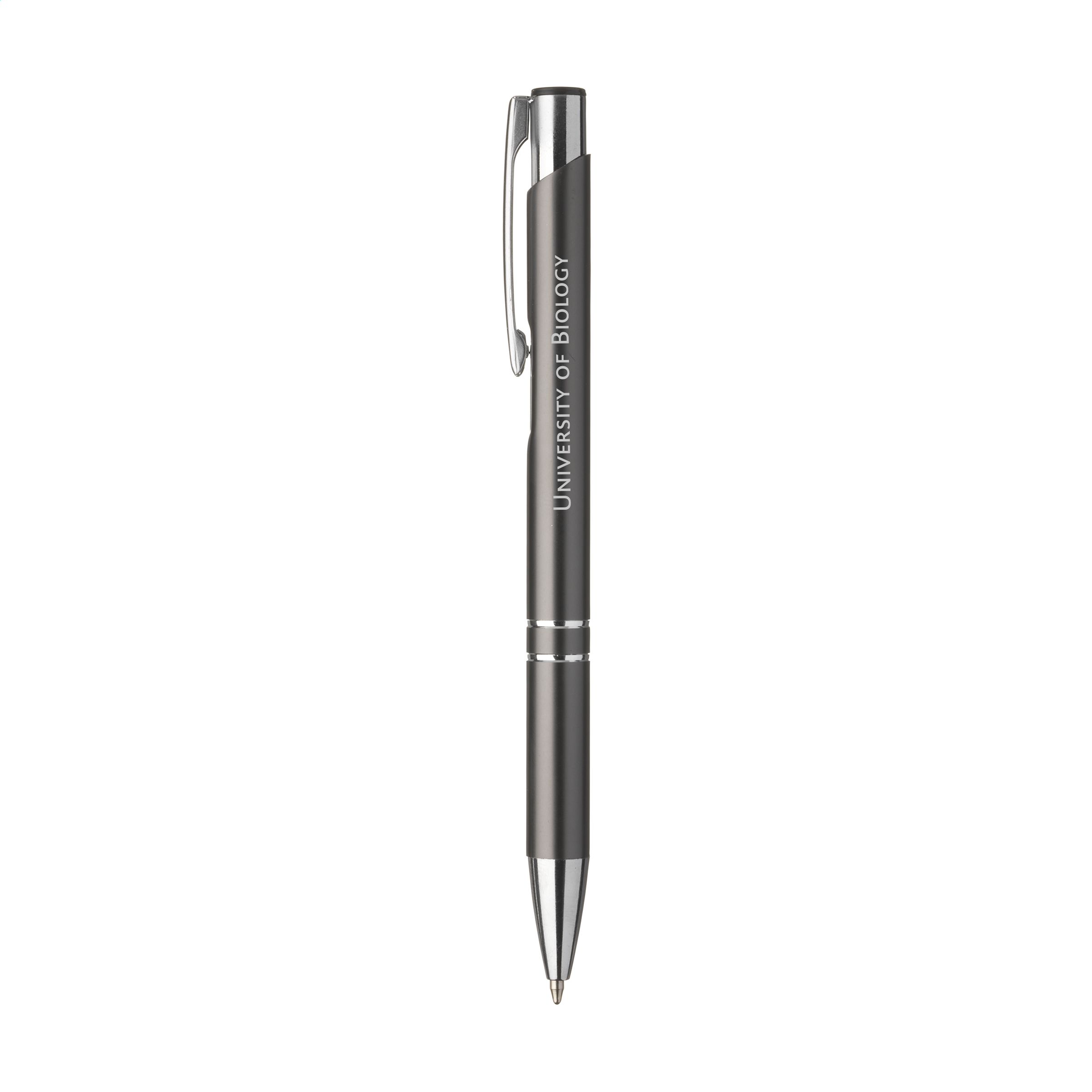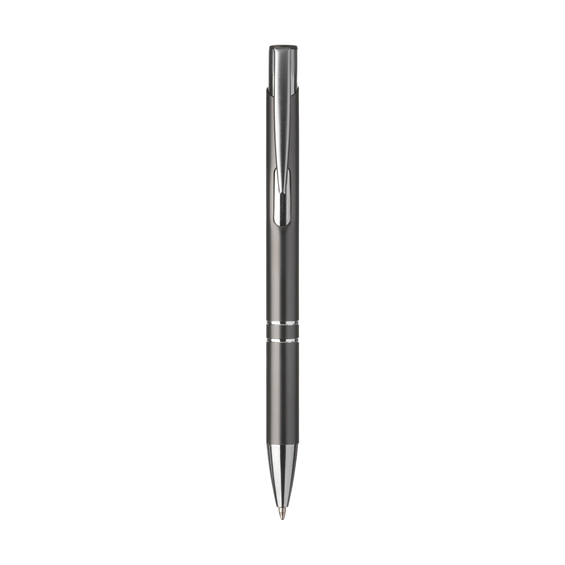Beschreibung: Blauschreibender oder schwarzschreibender Kugelschreiber aus Aluminium mit mattfarbenem Gehäuse in Metalloptik und metallenem Clip / Druckknopf.
