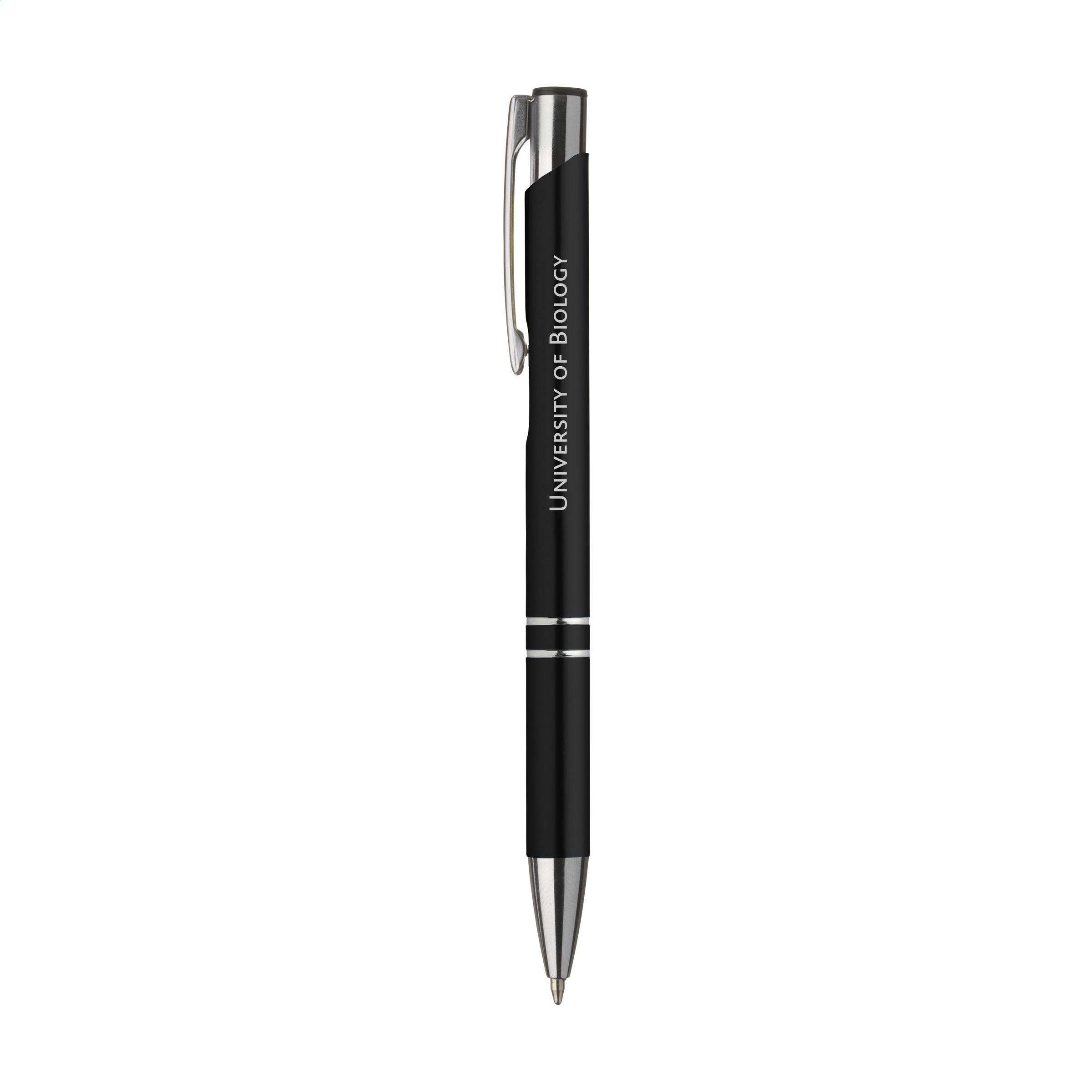 Beschreibung: Blauschreibender oder schwarzschreibender Kugelschreiber aus Aluminium mit mattfarbenem Gehäuse in Metalloptik und metallenem Clip / Druckknopf.
