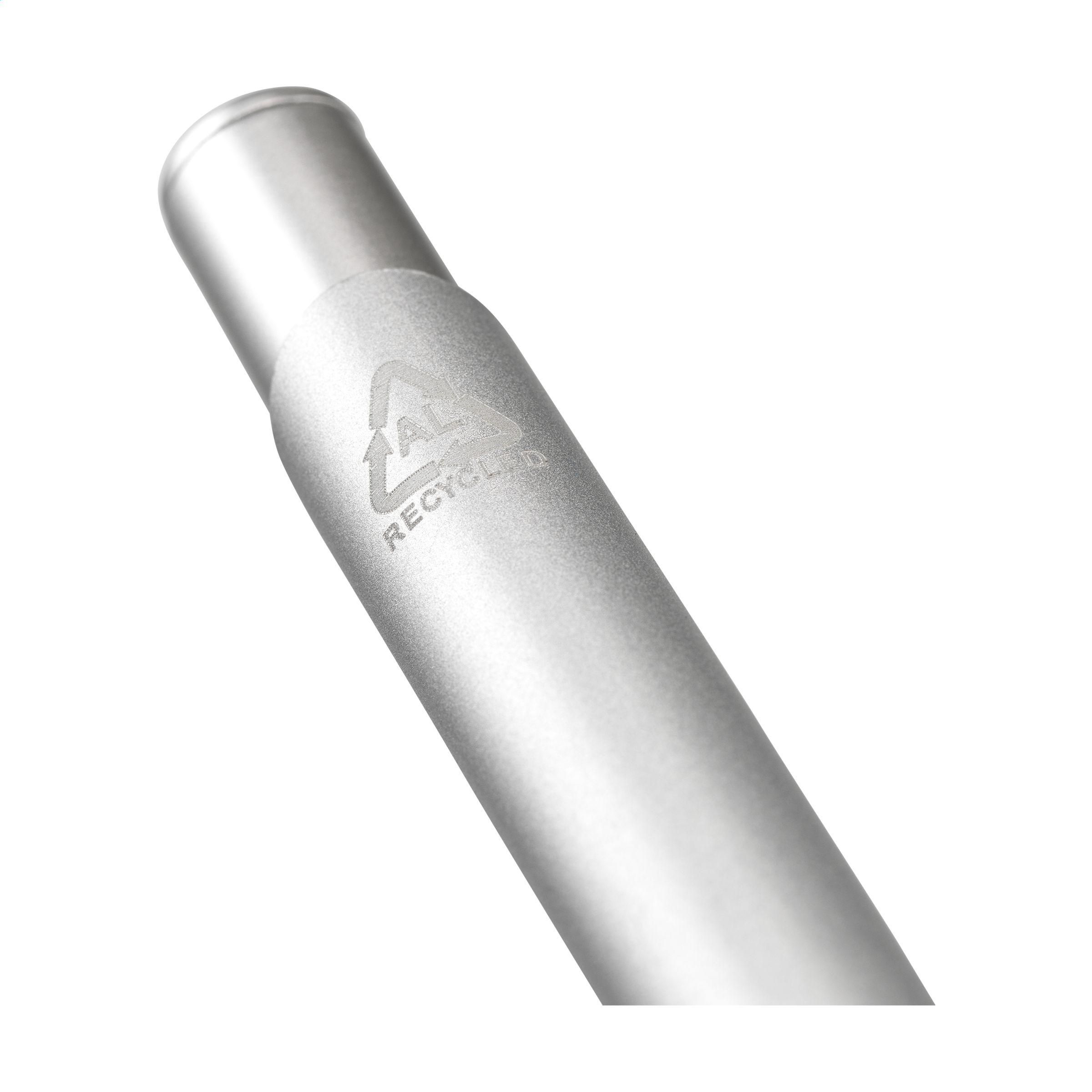 Beschreibung: Blau schreibender Kugelschreiber mit einem Gehäuse aus 100% recyceltem Aluminium. Mit Metallclip, Kunststoffspitze und Druckknopf. RCS-zertifiziert.Durch die Verwendung von recyceltem Aluminium werden bei der Herstellung dieses Produkts weniger neue Rohstoffe verwendet. Das bedeutet weniger Energieverbrauch und weniger Wasserverbrauch.