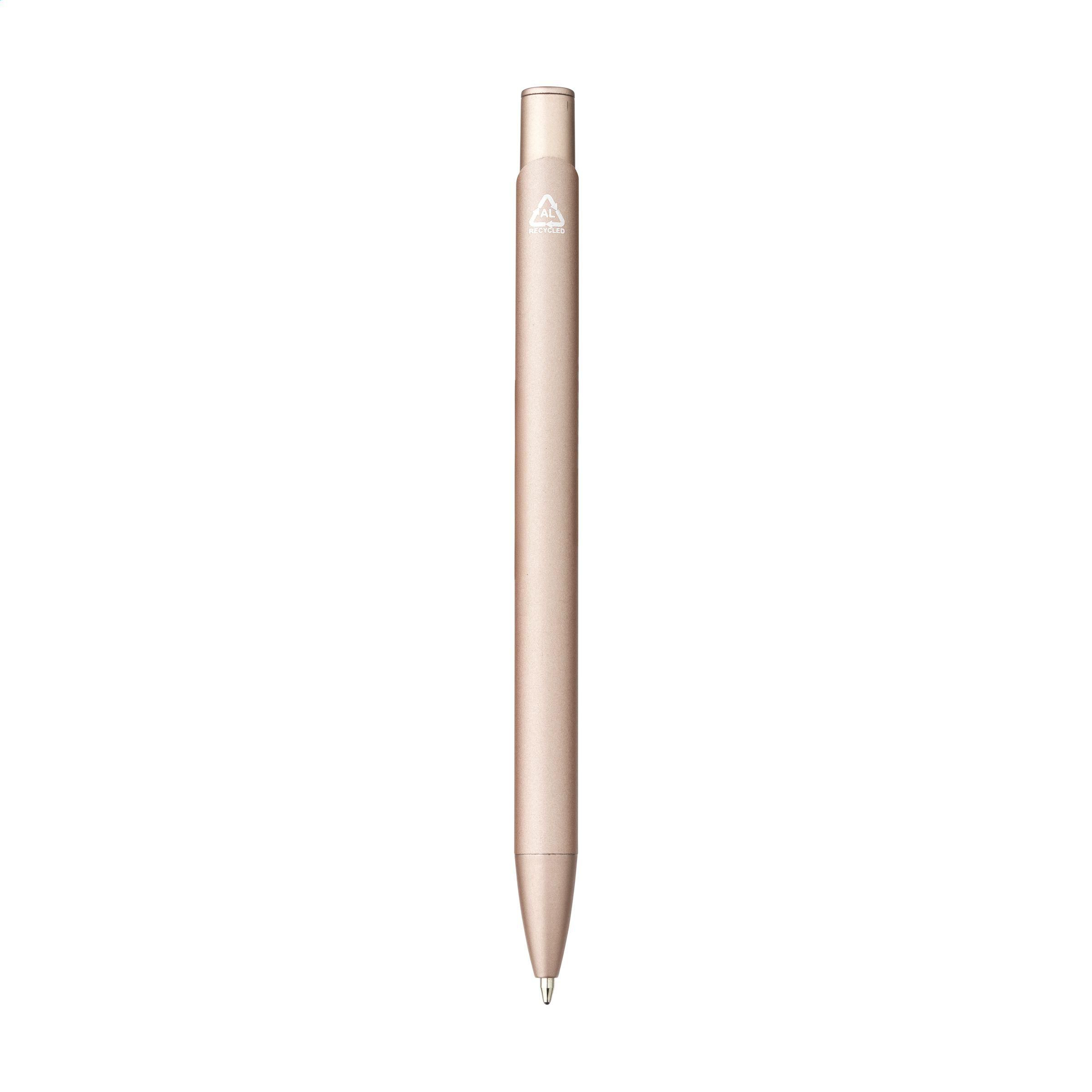 Beschreibung: Blau schreibender Kugelschreiber mit einem Gehäuse aus 100% recyceltem Aluminium. Mit Metallclip, Kunststoffspitze und Druckknopf. RCS-zertifiziert.Durch die Verwendung von recyceltem Aluminium werden bei der Herstellung dieses Produkts weniger neue Rohstoffe verwendet. Das bedeutet weniger Energieverbrauch und weniger Wasserverbrauch.