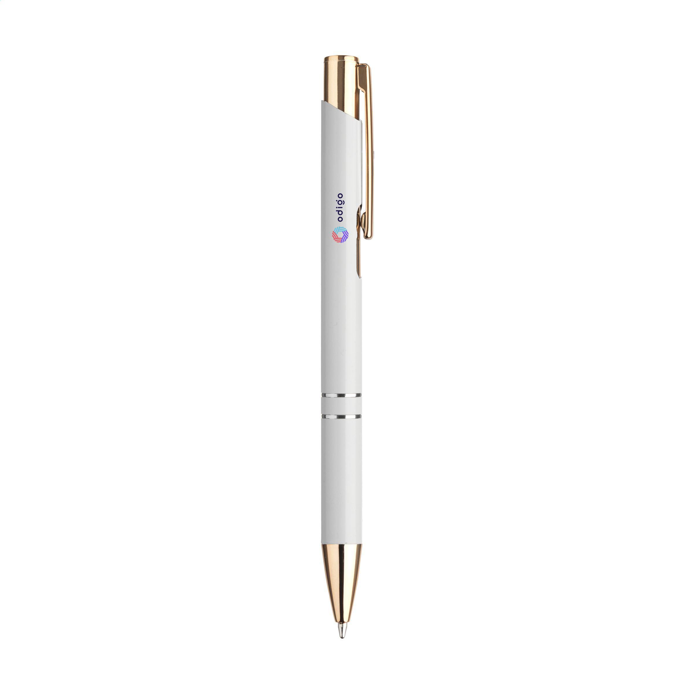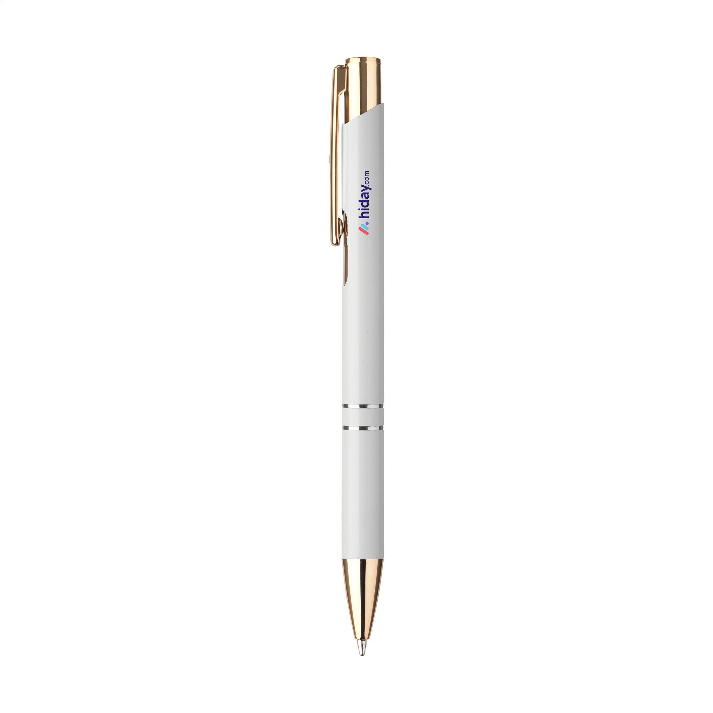 Beschreibung: Blauschreibender Kugelschreiber aus recyceltem Aluminium mit einem stabilen, roségoldenen Clip/Druckknopf, ebenfalls aus recyceltem Aluminium. Der Kugelschreiber hat elegante roségoldene und silberne Akzente, die ihm ein auffallend schickes Aussehen verleihen. RCS-zertifiziert. Gesamtes recyceltes Material: 94%. Durch die Verwendung von recyceltem Aluminium werden bei der Herstellung dieses Produkts weniger neue Rohstoffe verwendet. Das bedeutet weniger Energieverbrauch und weniger Wasserverbrauch.