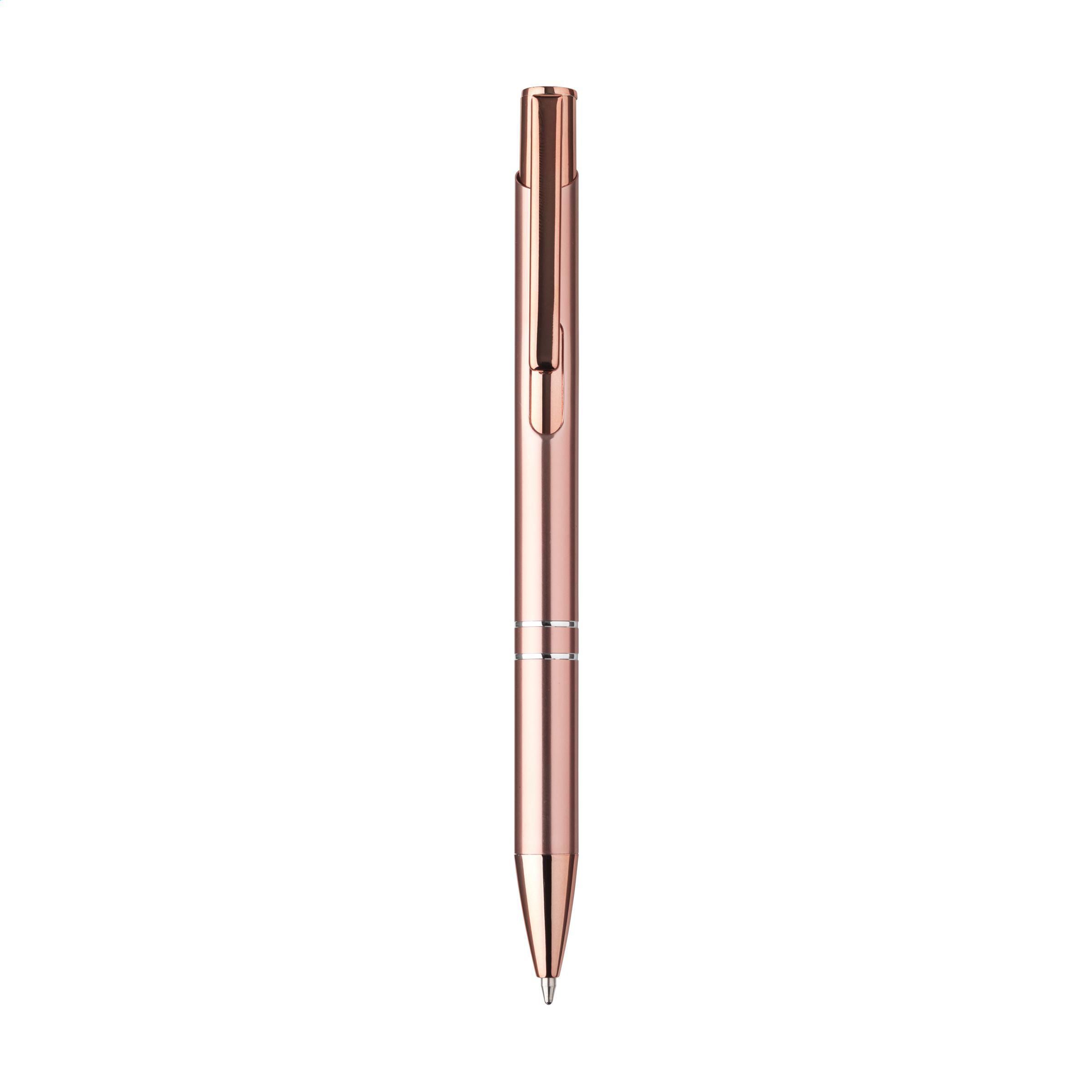 Beschreibung: Blauschreibender Kugelschreiber aus recyceltem Aluminium mit einem stabilen, roségoldenen Clip/Druckknopf, ebenfalls aus recyceltem Aluminium. Der Kugelschreiber hat elegante roségoldene und silberne Akzente, die ihm ein auffallend schickes Aussehen verleihen. RCS-zertifiziert. Gesamtes recyceltes Material: 94%. Durch die Verwendung von recyceltem Aluminium werden bei der Herstellung dieses Produkts weniger neue Rohstoffe verwendet. Das bedeutet weniger Energieverbrauch und weniger Wasserverbrauch.