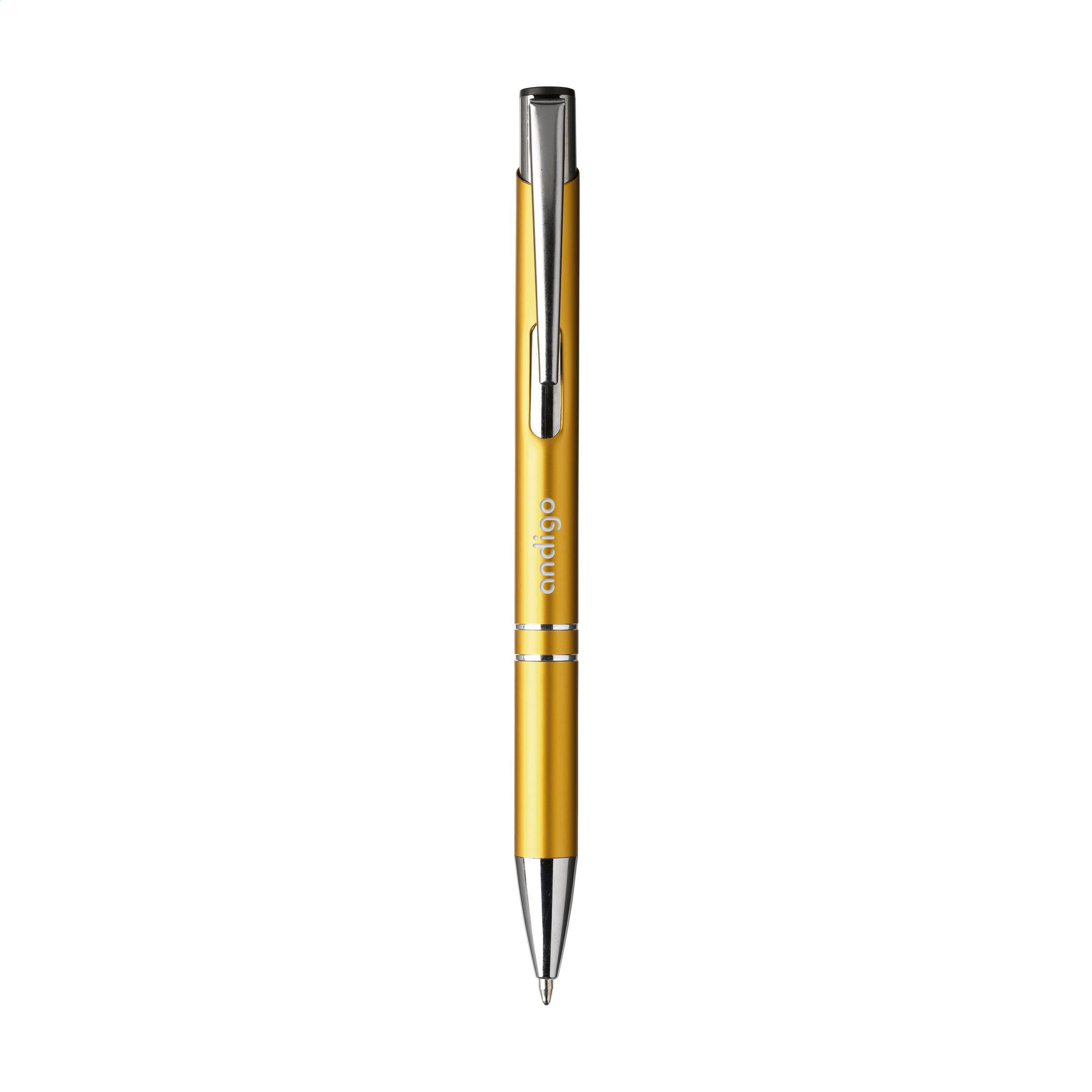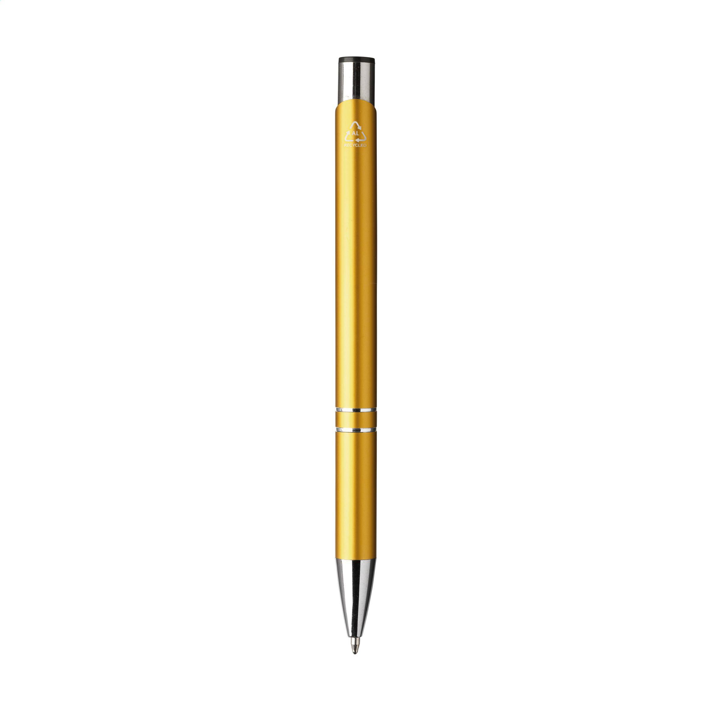 Beschreibung: Blauschreibender Kugelschreiber aus recyceltem Aluminium. Der Halter ist mit einer wunderschön glänzenden Oberfläche im Metallic-Look versehen. Mit Metallclip. Durch die Verwendung von recyceltem Aluminium werden bei der Herstellung dieses Produkts weniger neue Rohstoffe verwendet. Das bedeutet weniger Energieverbrauch und weniger Wasserverbrauch.