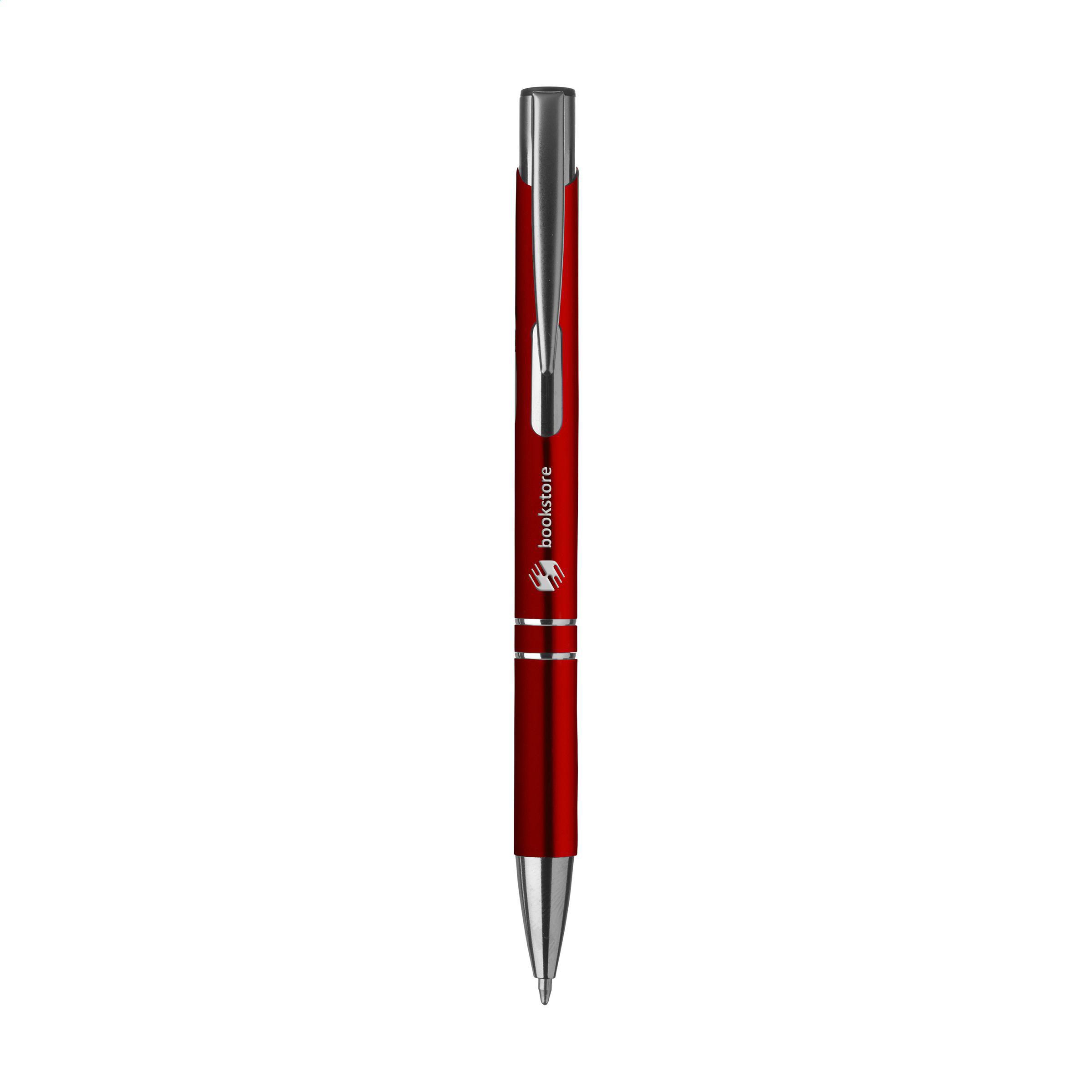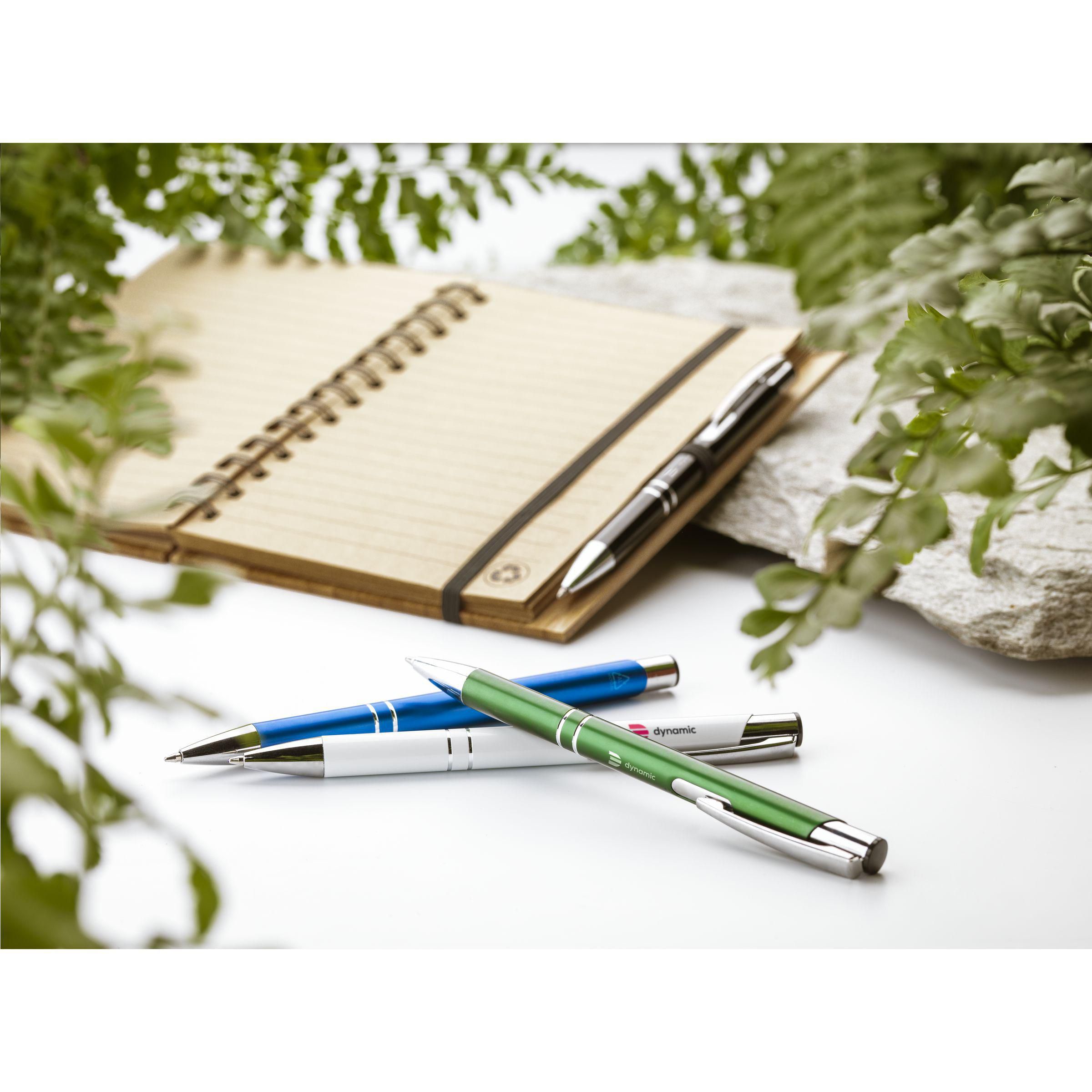 Beschreibung: Blauschreibender Kugelschreiber aus recyceltem Aluminium. Der Halter ist mit einer wunderschön glänzenden Oberfläche im Metallic-Look versehen. Mit Metallclip. Durch die Verwendung von recyceltem Aluminium werden bei der Herstellung dieses Produkts weniger neue Rohstoffe verwendet. Das bedeutet weniger Energieverbrauch und weniger Wasserverbrauch.
