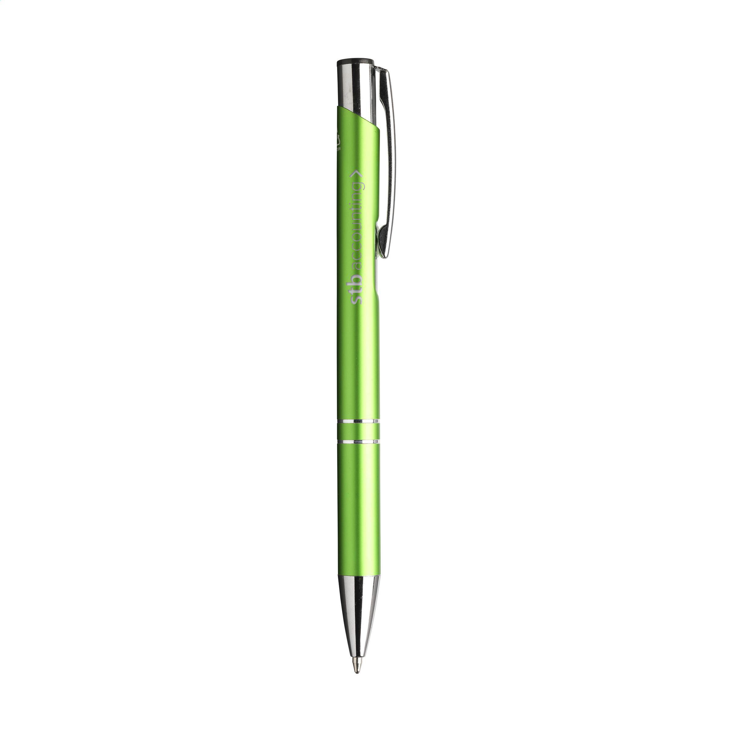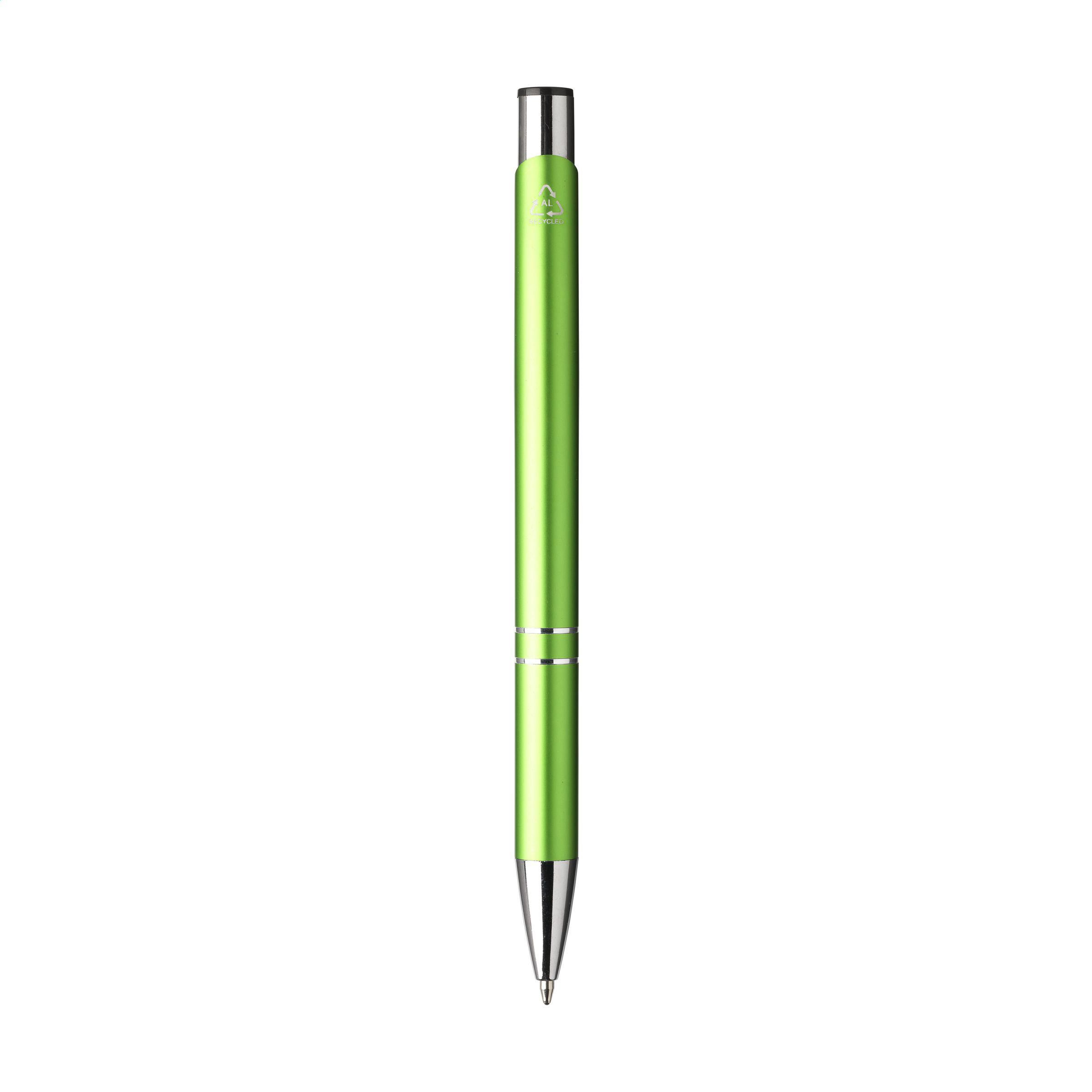 Beschreibung: Blauschreibender Kugelschreiber aus recyceltem Aluminium. Der Halter ist mit einer wunderschön glänzenden Oberfläche im Metallic-Look versehen. Mit Metallclip. Durch die Verwendung von recyceltem Aluminium werden bei der Herstellung dieses Produkts weniger neue Rohstoffe verwendet. Das bedeutet weniger Energieverbrauch und weniger Wasserverbrauch.