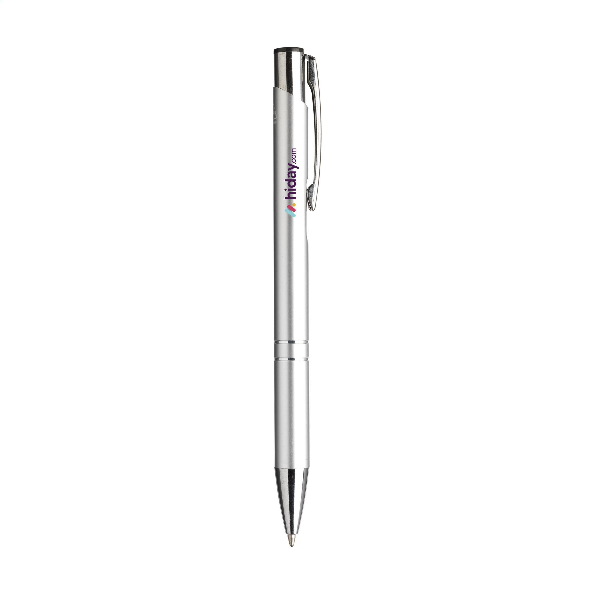 Beschreibung: Blauschreibender Kugelschreiber aus recyceltem Aluminium. Der Halter ist mit einer wunderschön glänzenden Oberfläche im Metallic-Look versehen. Mit Metallclip. Durch die Verwendung von recyceltem Aluminium werden bei der Herstellung dieses Produkts weniger neue Rohstoffe verwendet. Das bedeutet weniger Energieverbrauch und weniger Wasserverbrauch.