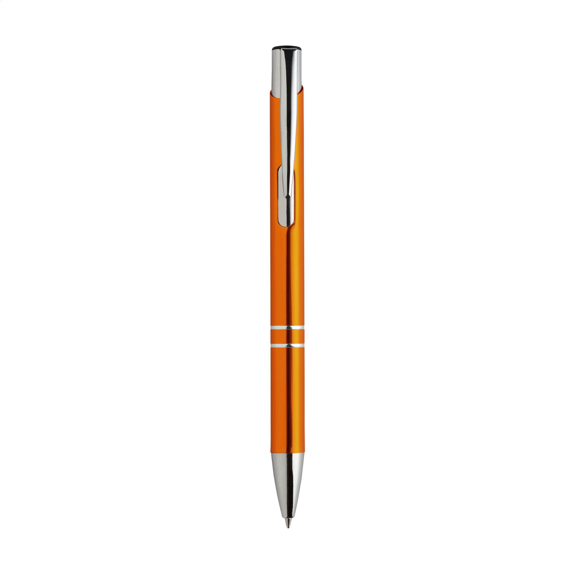 Beschreibung: Blauschreibender Aluminiumkugelschreiber mit glänzendem Gehäuse in Metalloptik und metallenem Clip.