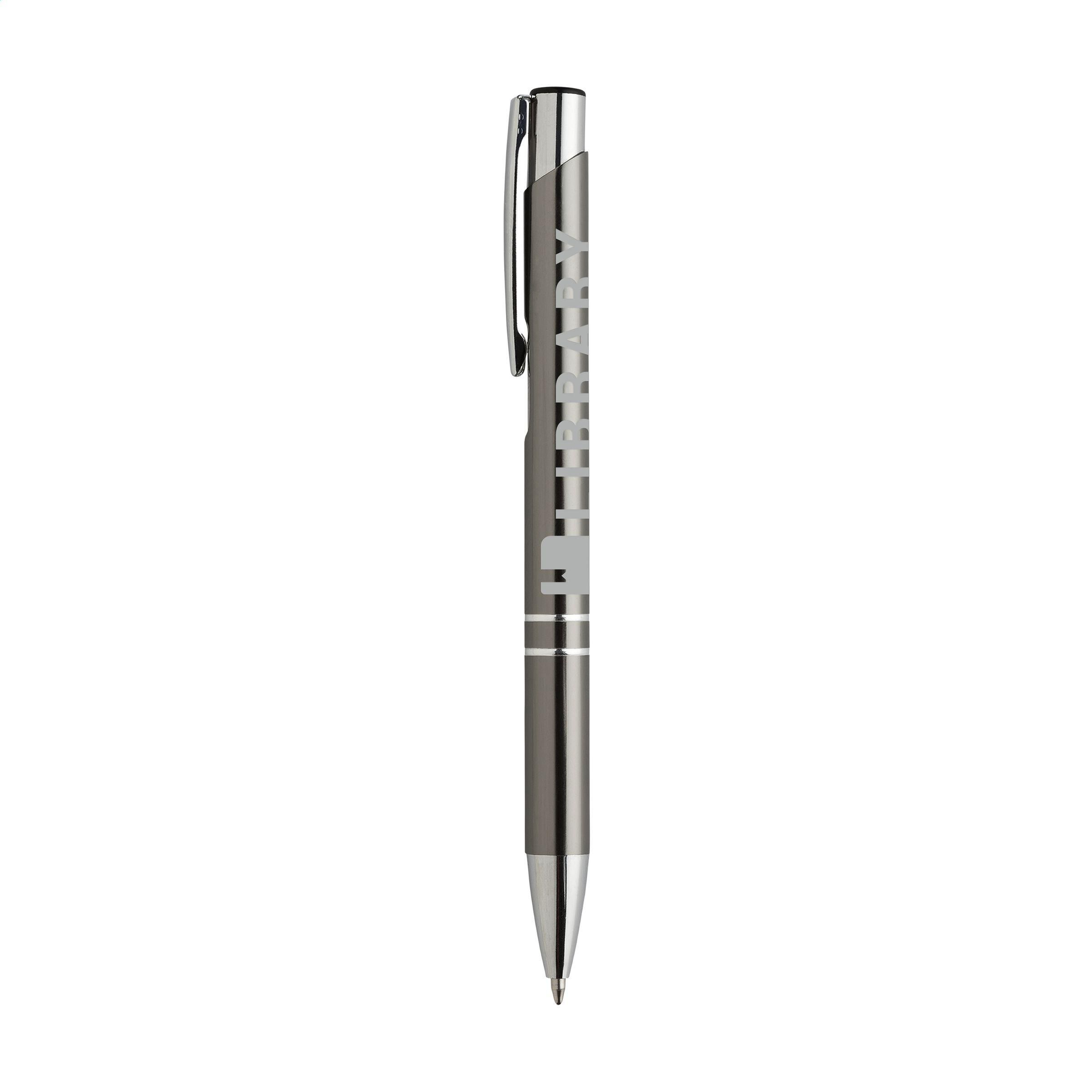 Beschreibung: Blauschreibender Aluminiumkugelschreiber mit glänzendem Gehäuse in Metalloptik und metallenem Clip.