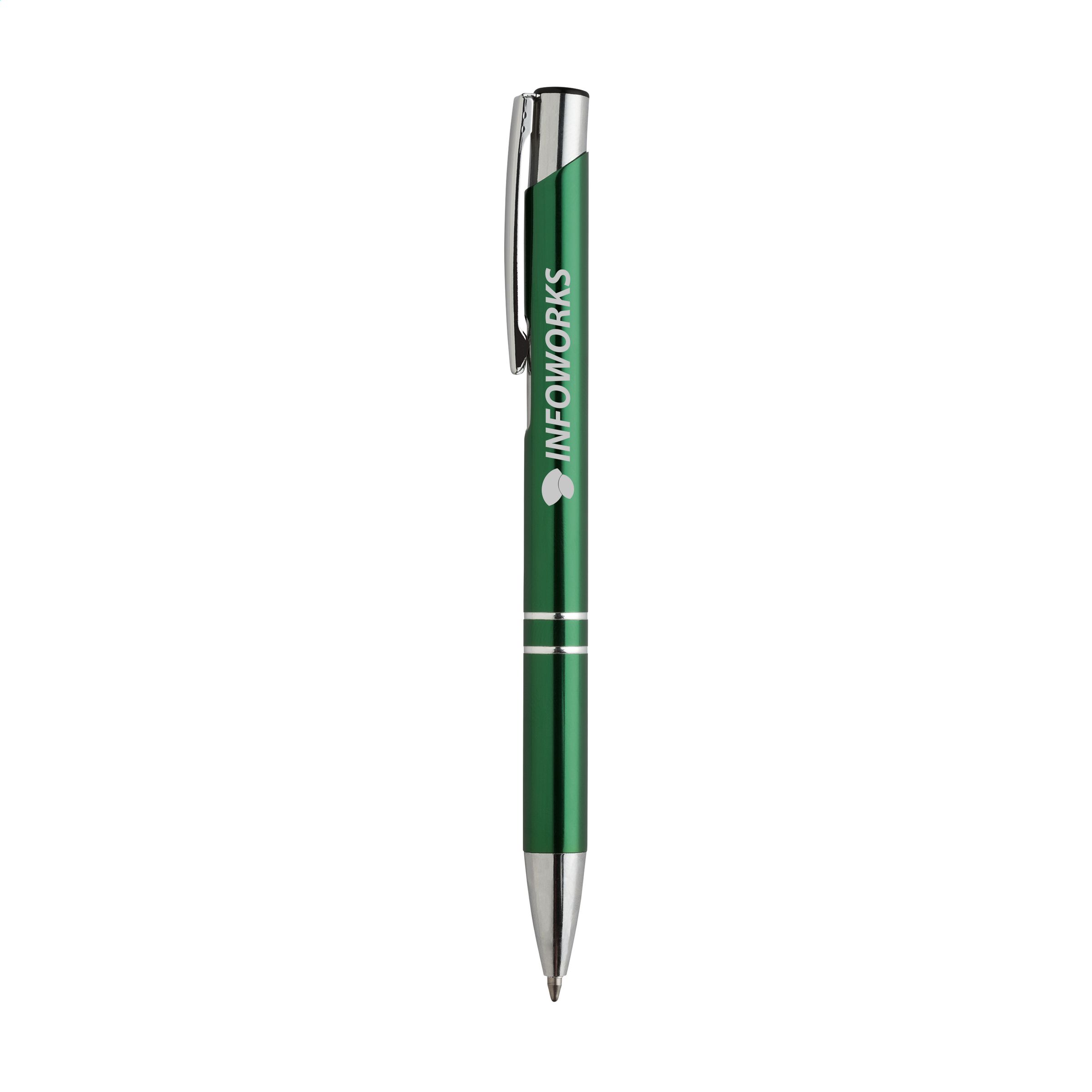 Beschreibung: Blauschreibender Aluminiumkugelschreiber mit glänzendem Gehäuse in Metalloptik und metallenem Clip.