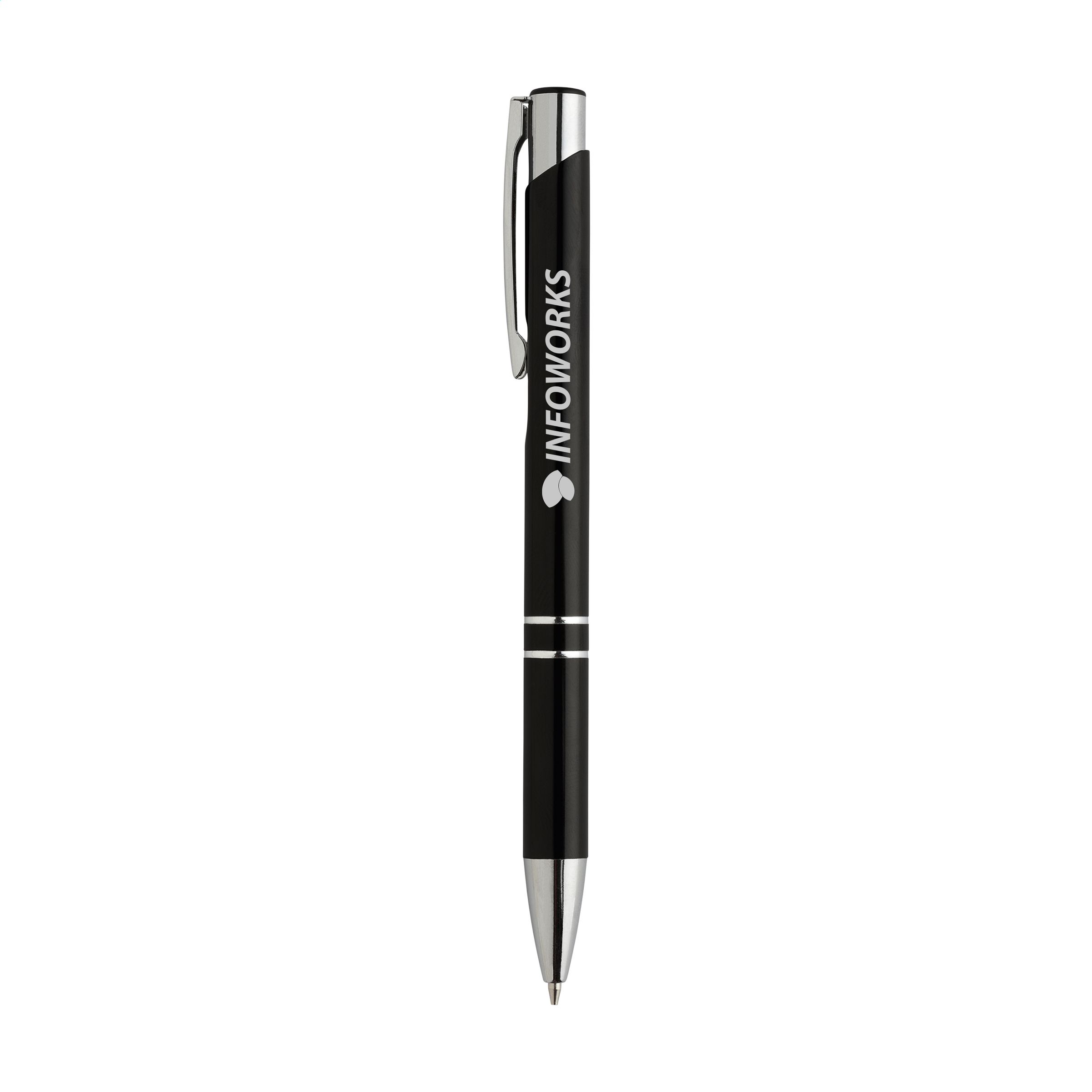 Beschreibung: Blauschreibender Aluminiumkugelschreiber mit glänzendem Gehäuse in Metalloptik und metallenem Clip.