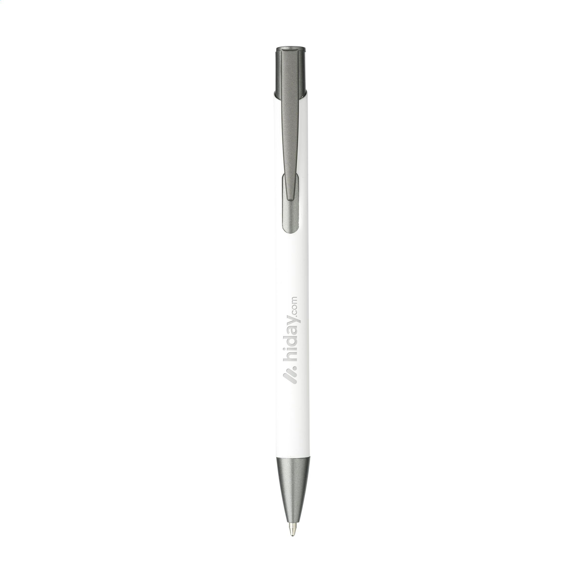Beschreibung: Blauschreibender Kugelschreiber mit einem Gehäuse aus recyceltem Aluminium. Das Gehäuse ist mit einer gummierten Soft-Touch-Oberfläche versehen. Mit Metallclip/Druckknopf. RCS-zertifiziert. Gesamtes recyceltes Material: 94%.Durch die Verwendung von recyceltem Aluminium werden bei der Herstellung dieses Produkts weniger neue Rohstoffe verwendet. Das bedeutet weniger Energieverbrauch und weniger Wasserverbrauch.