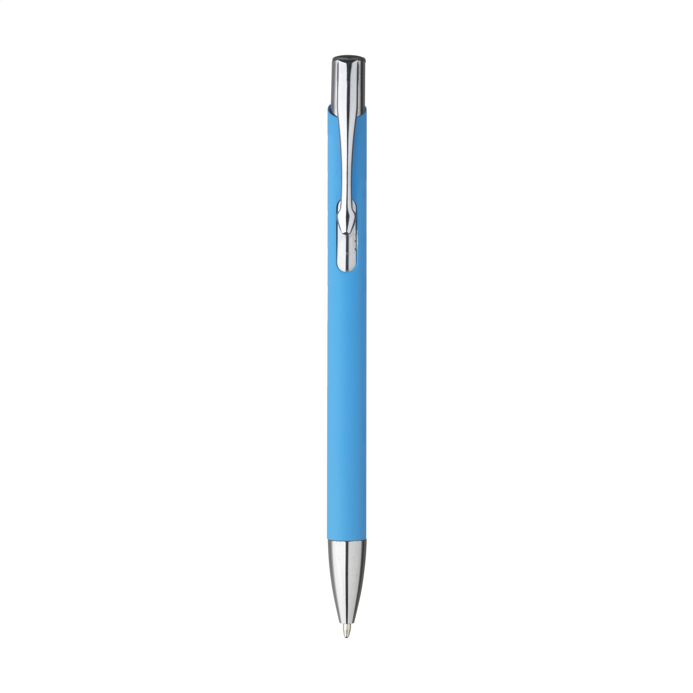 Beschreibung: Blauschreibender Aluminium-Kugelschreiber mit Metallclip. Der Halter ist mit einer schönen gummierten Oberfläche versehen. Durch den einteiligen Halter bietet dieser Stift Platz für einen großen Aufdruck.