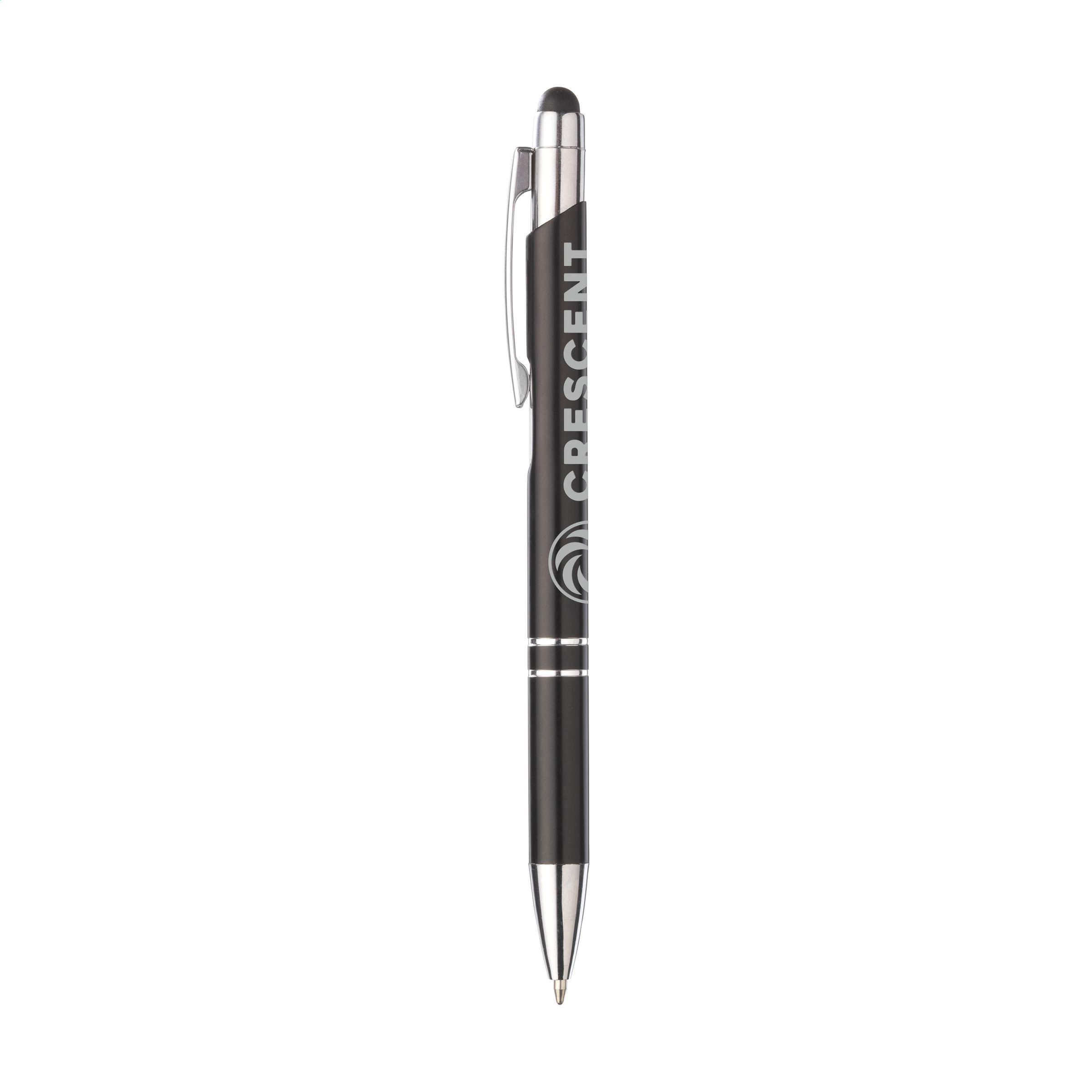 Beschreibung: Blauschreibender Kugelschreiber mit Aluminiumgehäuse, gummierte Spitze zum Bedienen von Touchscreens (wie iPhone/iPad), mattfarbenes Metallgehäuse und Metallclip/-druckknopf.