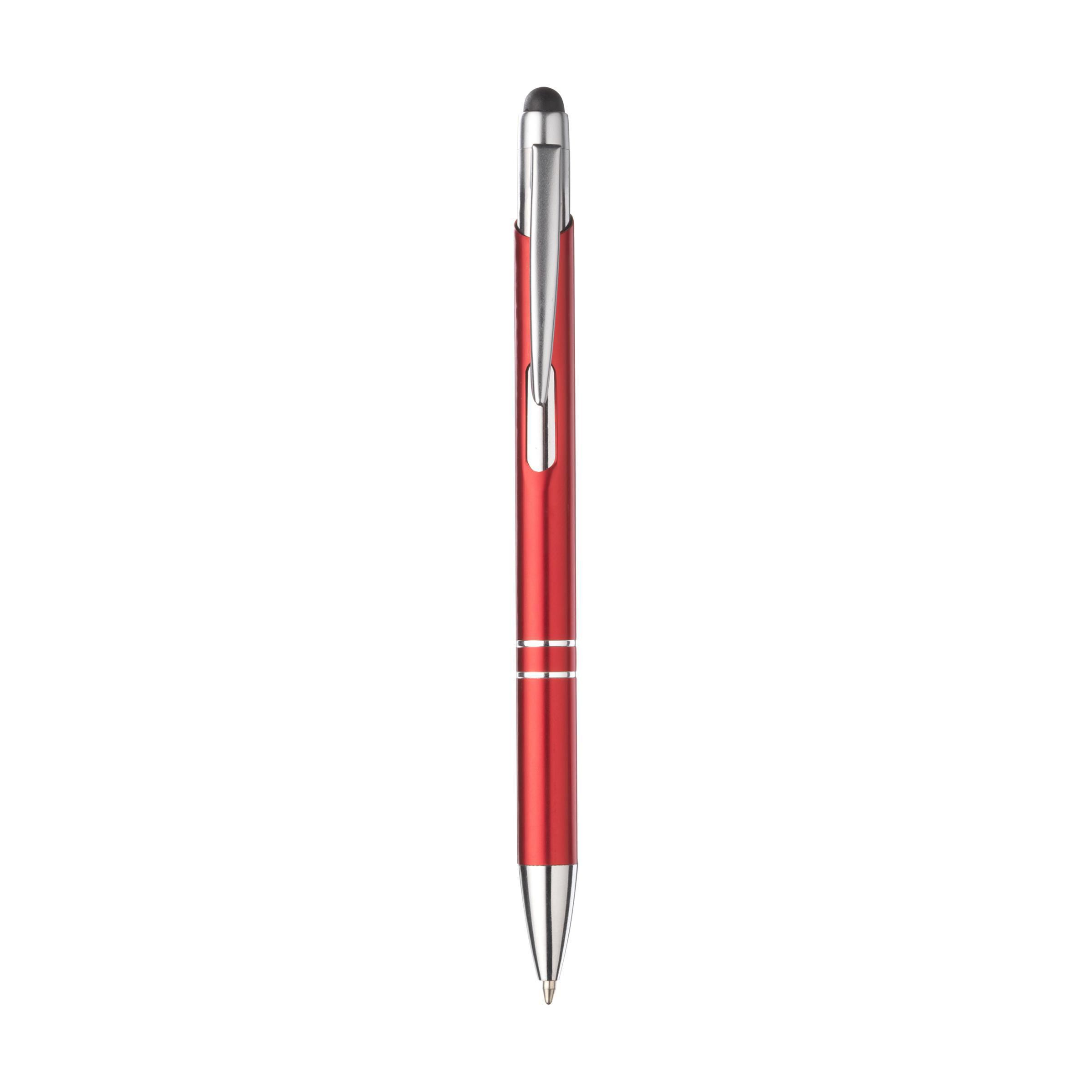 Beschreibung: Blauschreibender Kugelschreiber mit Aluminiumgehäuse, gummierte Spitze zum Bedienen von Touchscreens (wie iPhone/iPad), mattfarbenes Metallgehäuse und Metallclip/-druckknopf.