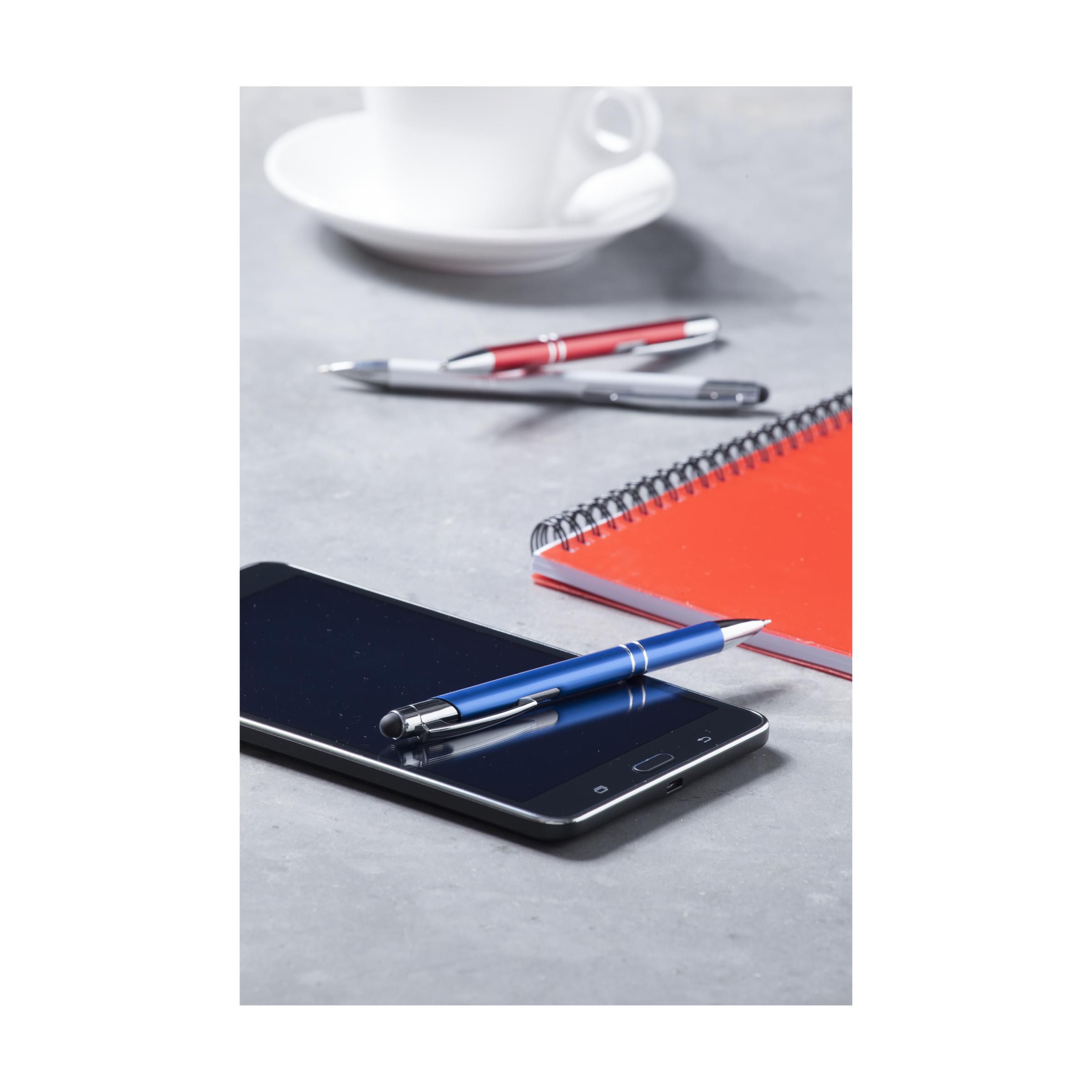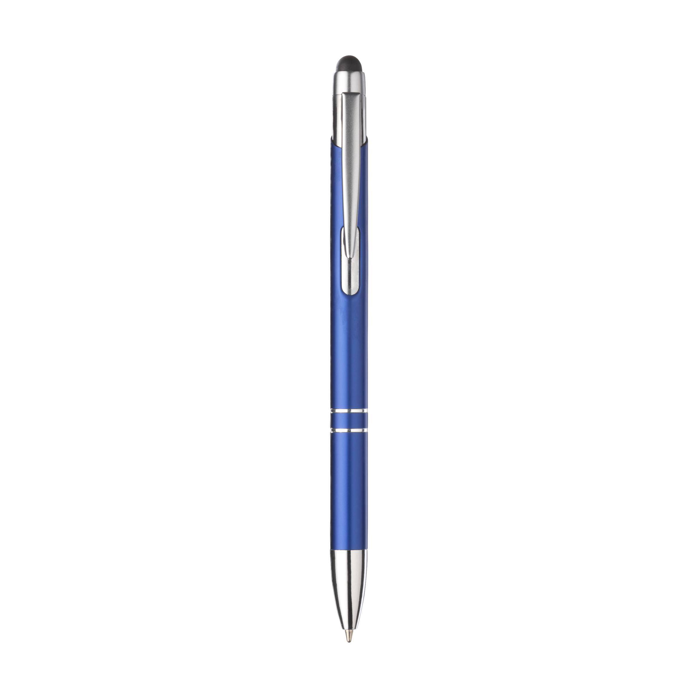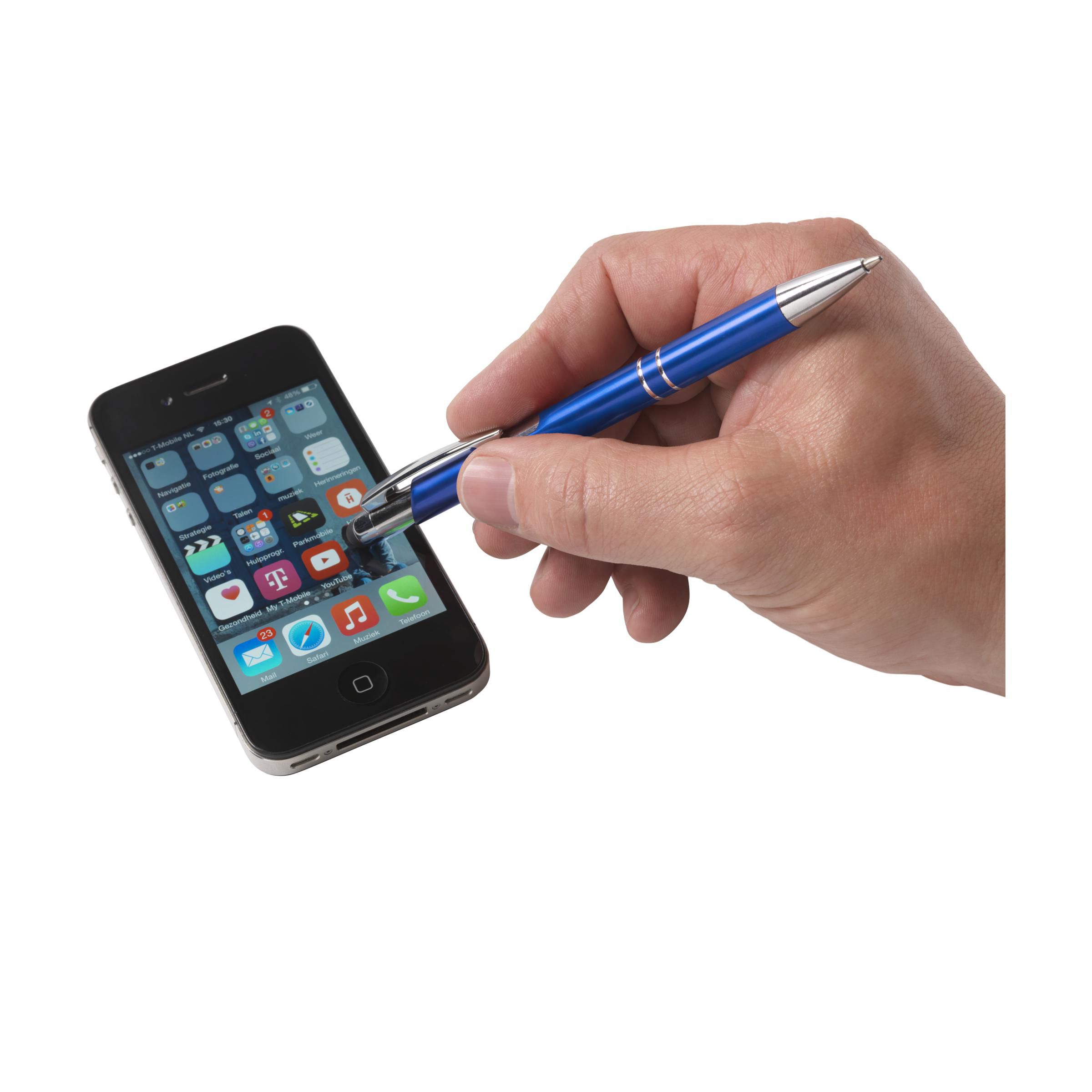 Beschreibung: Blauschreibender Kugelschreiber mit Aluminiumgehäuse, gummierte Spitze zum Bedienen von Touchscreens (wie iPhone / iPad), mattfarbenes Metallgehäuse und Metallclip/-druckknopf.