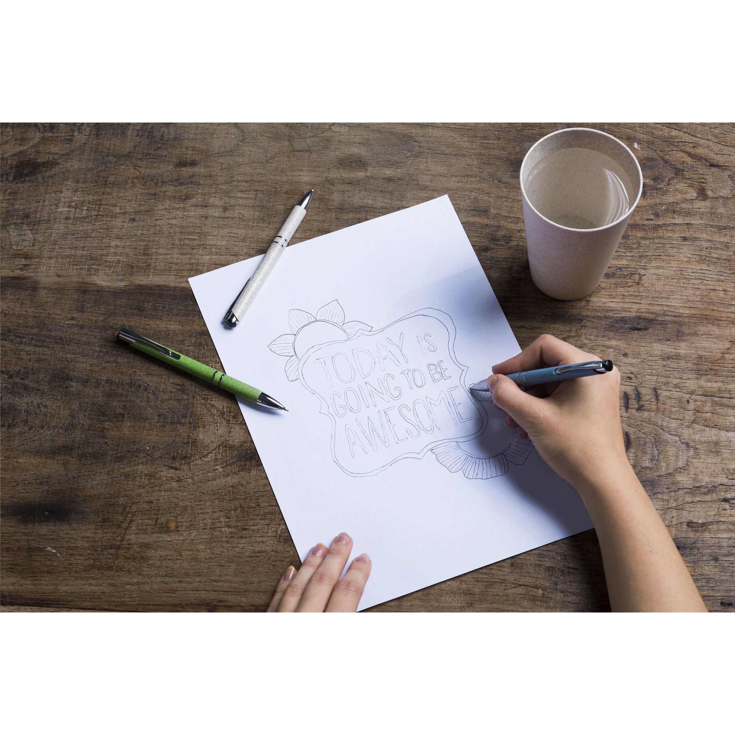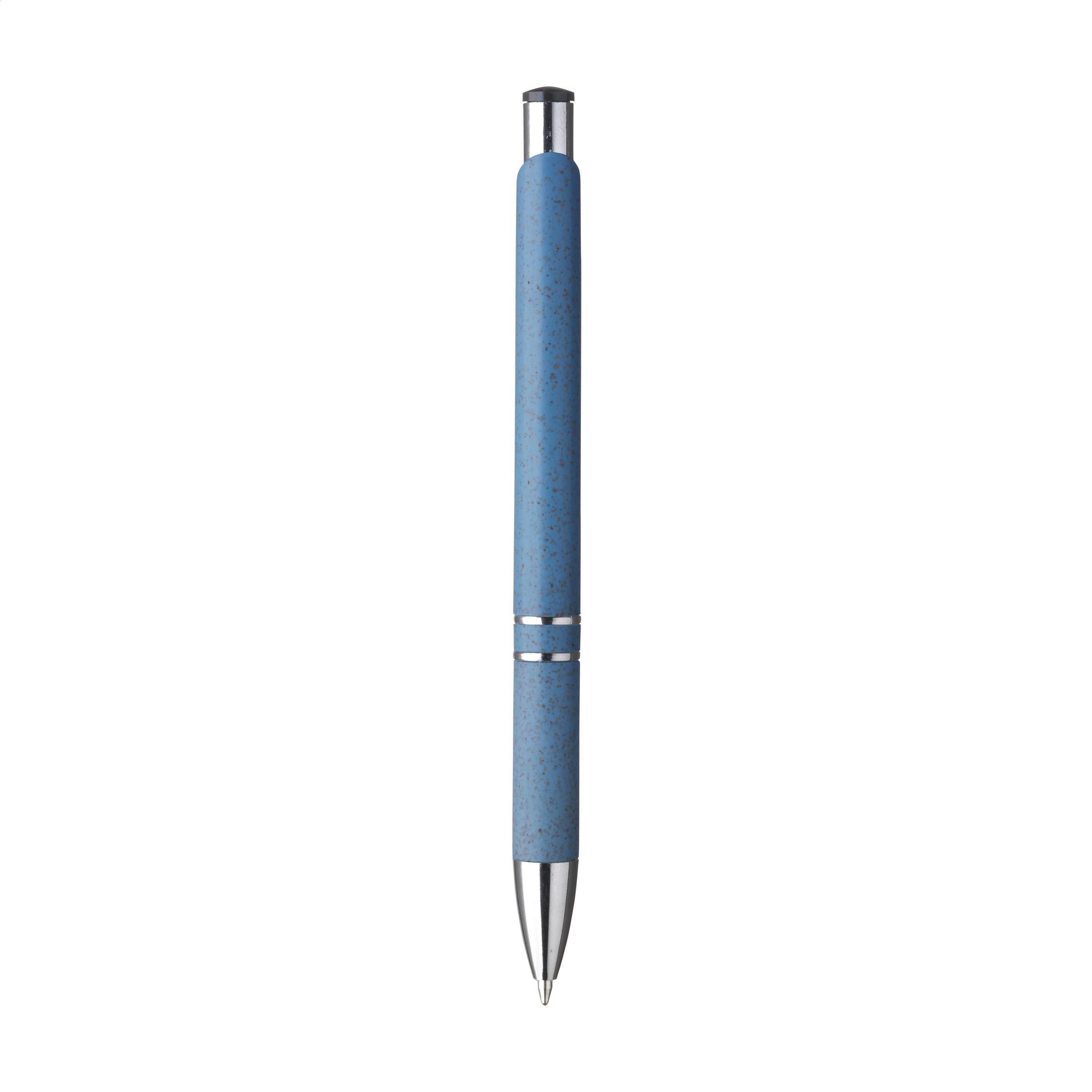 Beschreibung: Blauschreibender Kugelschreiber mit Gehäuse aus 50% ABS und 50% Weizenstroh, Metallclip und Chromakzenten aus Kunststoff.