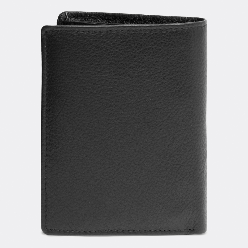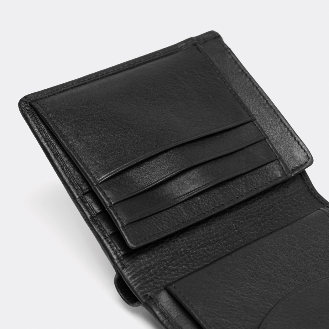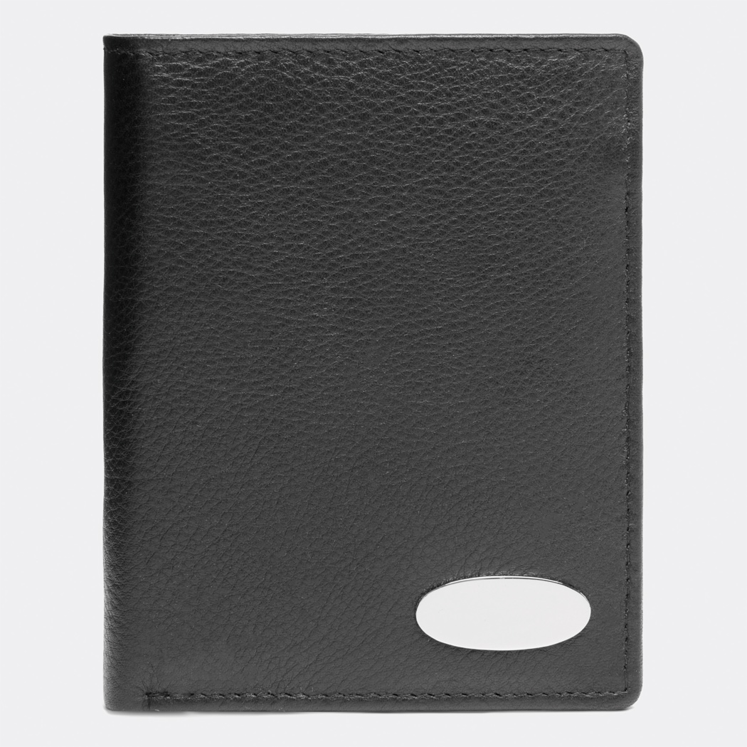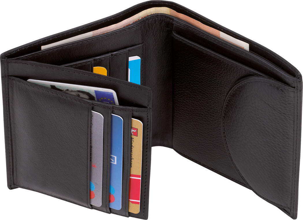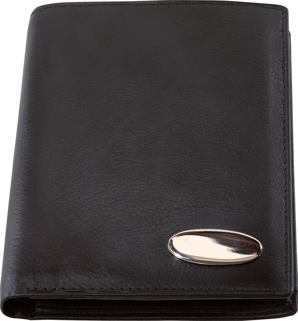 Echtleder-Geldbörse DOW JONES - im Hochformat: innen 6 Einsteckfächer für Geldkarten, 2 Geldscheinfächer, 1 Münzfach mit Druckknopfverschluss für Kleingeld, 1 Netzfach, 4 zusätzliche Fächer, 1 Fach für Einkaufswagen-Chip - außen mit ovaler Metallplatte für eine Werbeanbringung, in Box