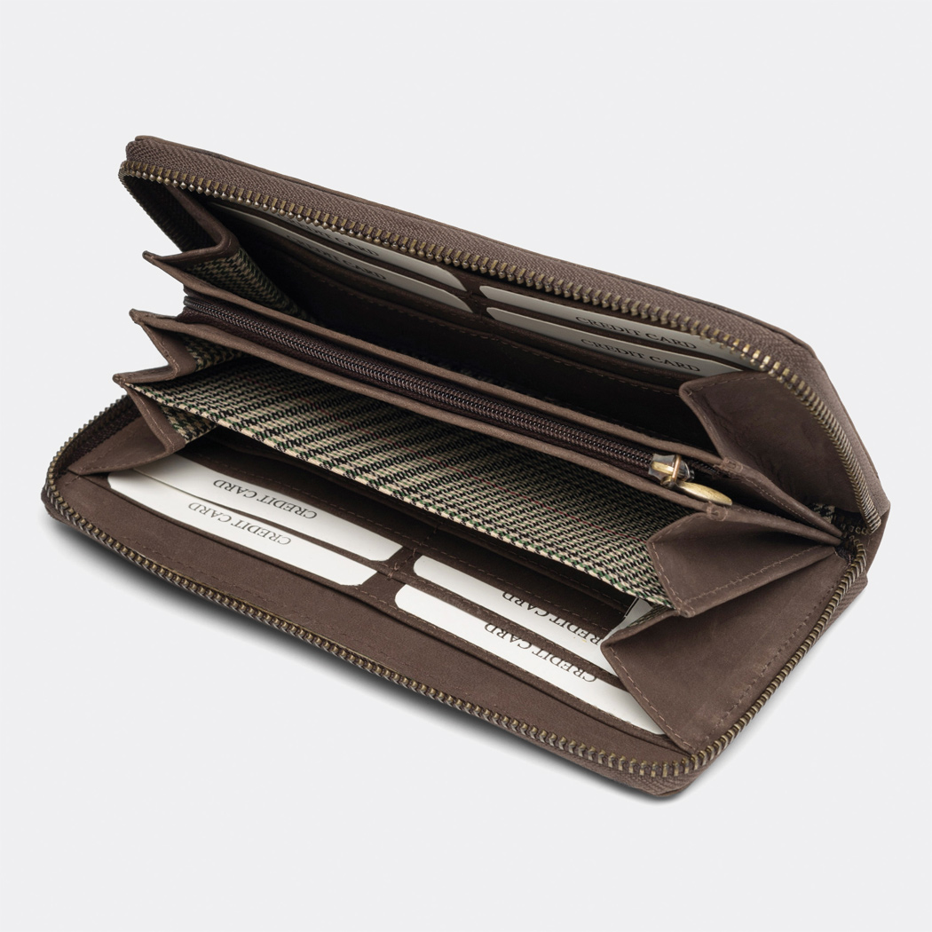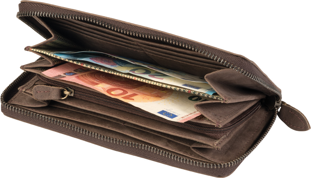 Echtleder-Geldbörse LADY: mit Reißverschluss zum Verschließen, innen 12 Einsteckfächer für Geldkarten mit RFID-Abschirmung zum Schutz vor unerwünschtem Scannen, 3 Geldscheinfächer, 1 Münzfach mit Reißverschluss für Kleingeld, 2 zusätzliche Fächer, in Box