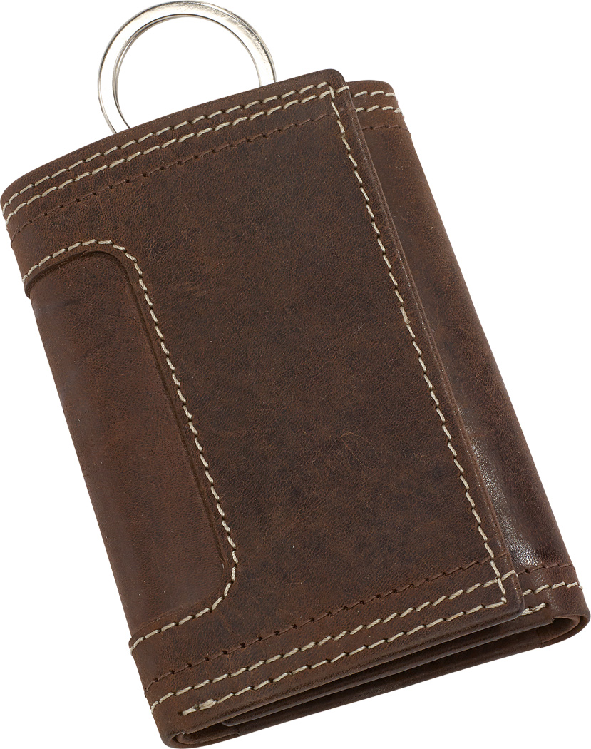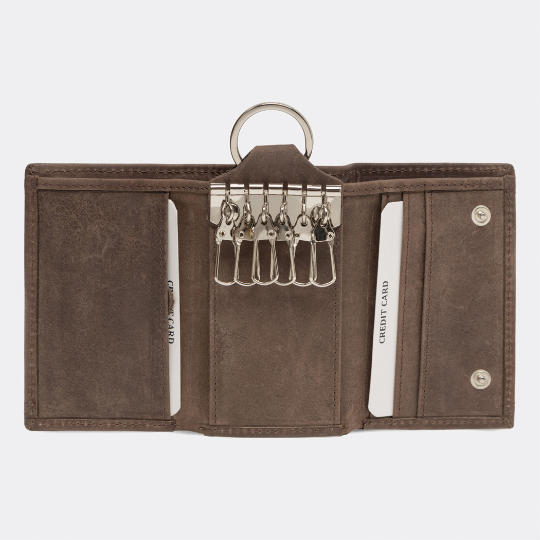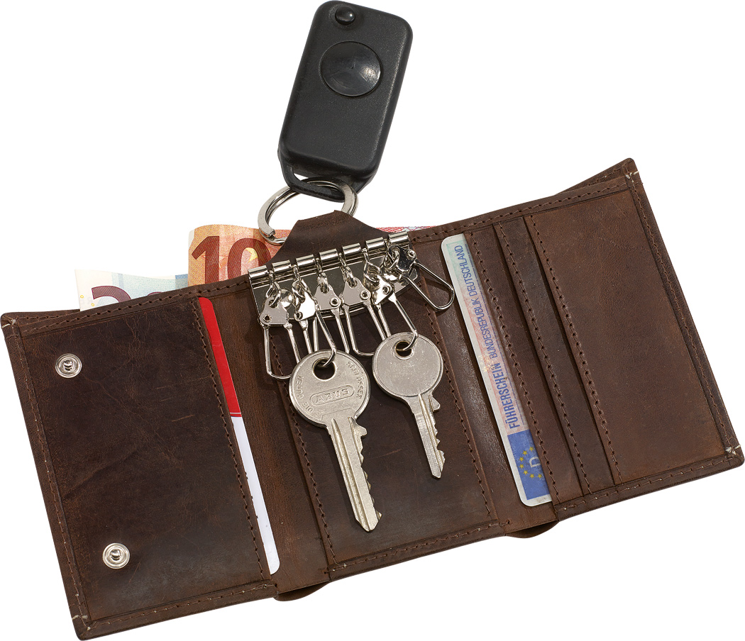 Echtleder-Schlüsseletui WILD STYLE III: mit 2 Druckknöpfen zum Verschließen, 1 großer Schlüsselring, innen 6 kleine Schlüsselhaken, 4 Einsteckfächer für Geldkarten, 1 Geldscheinfach, außen dekorative Ziernähte, in Box