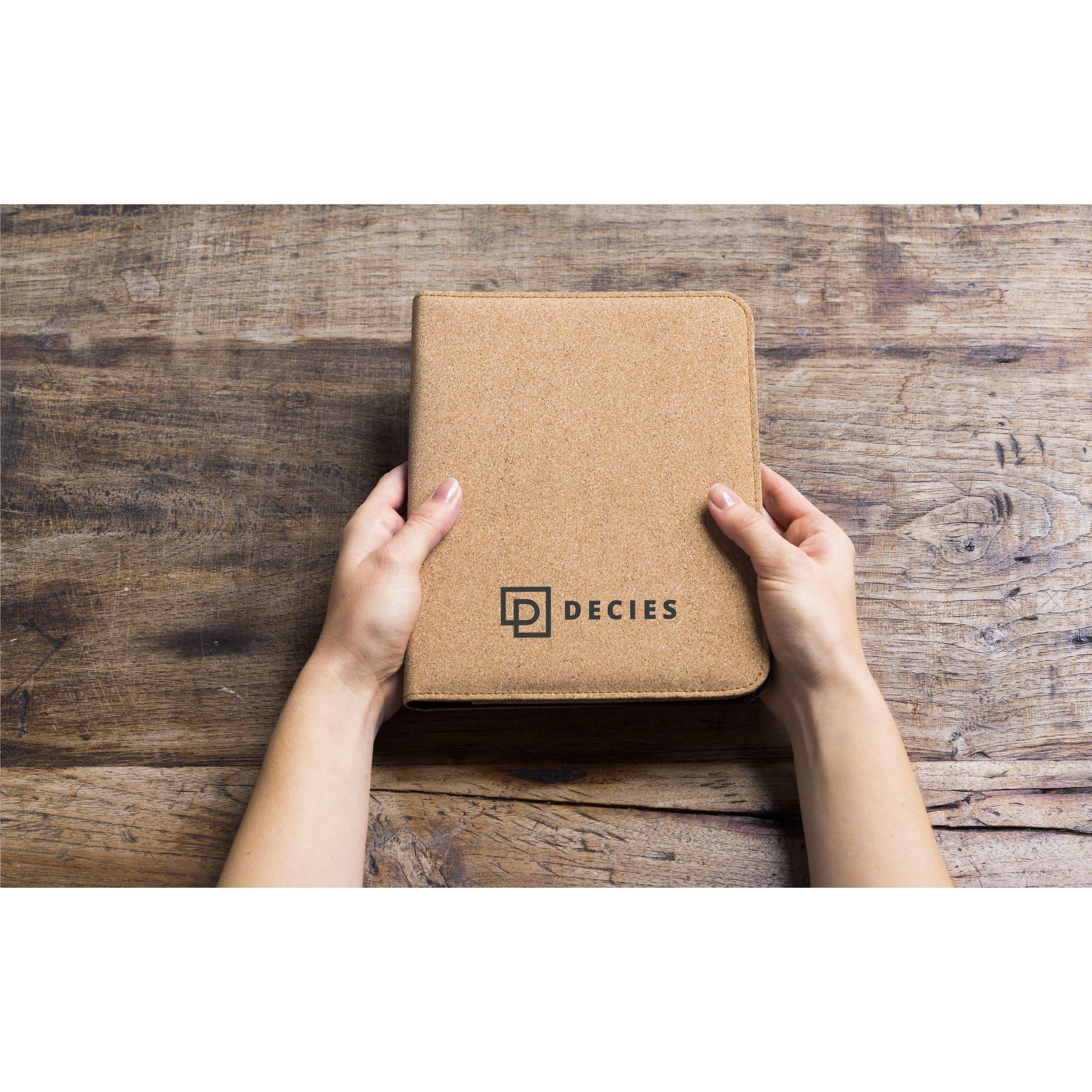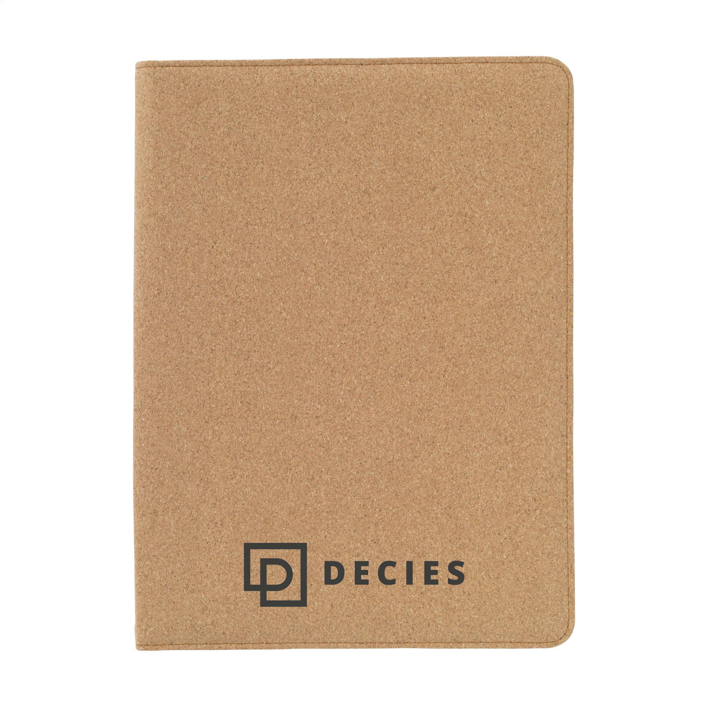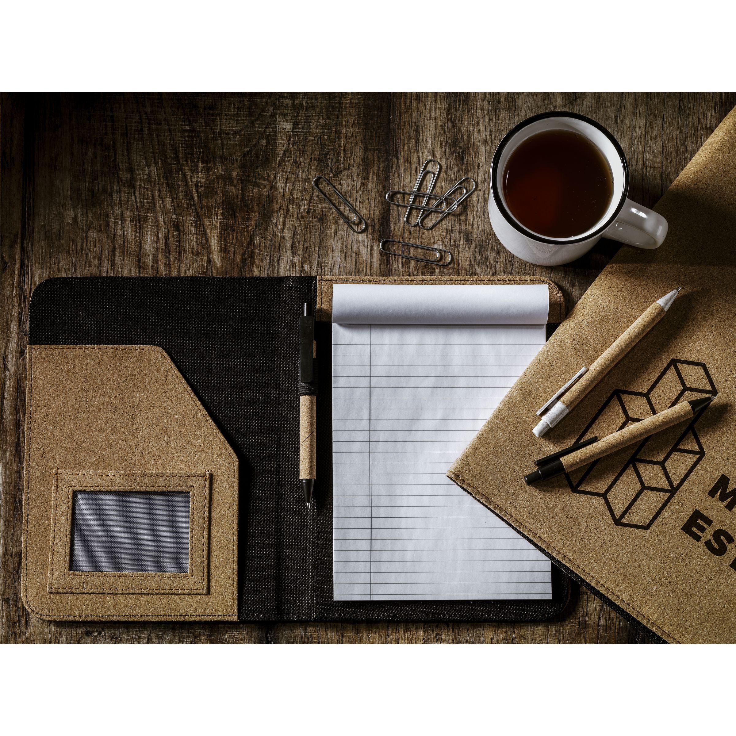 Schreibmappe/Dokumentenmapp im A4-Format. Mit FSC Mix zertifiziertem Korküberzug und Einsteckfach. Innen mit Vliesstoff ausgekleidet. Inkl. liniertem Schreibblock (ca. 30 Blatt) und Kugelschreiber mit blauer Tinte aus Kork und Weizenstroh.