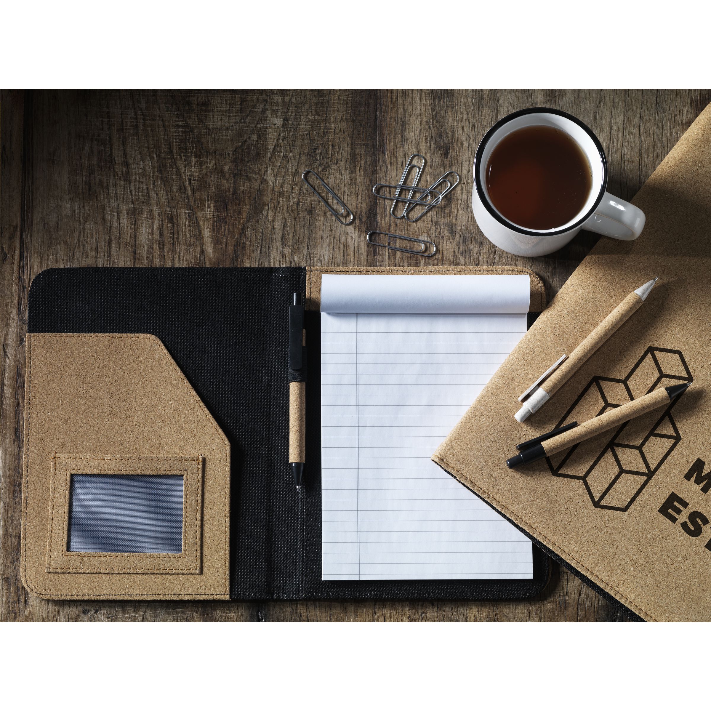 WoW! Schreibmappe / Dokumentenmapp im A5-Format, mit FSC Mix zertifiziertem Korküberzug und Einsteckfach mit Kreditkartenfach. Innen mit Vliesstoff ausgekleidet. Inkl. liniertem Schreibblock (ca. 30 Blatt) und Kugelschreiber mit blauer Tinte aus Kork und Weizenstroh.