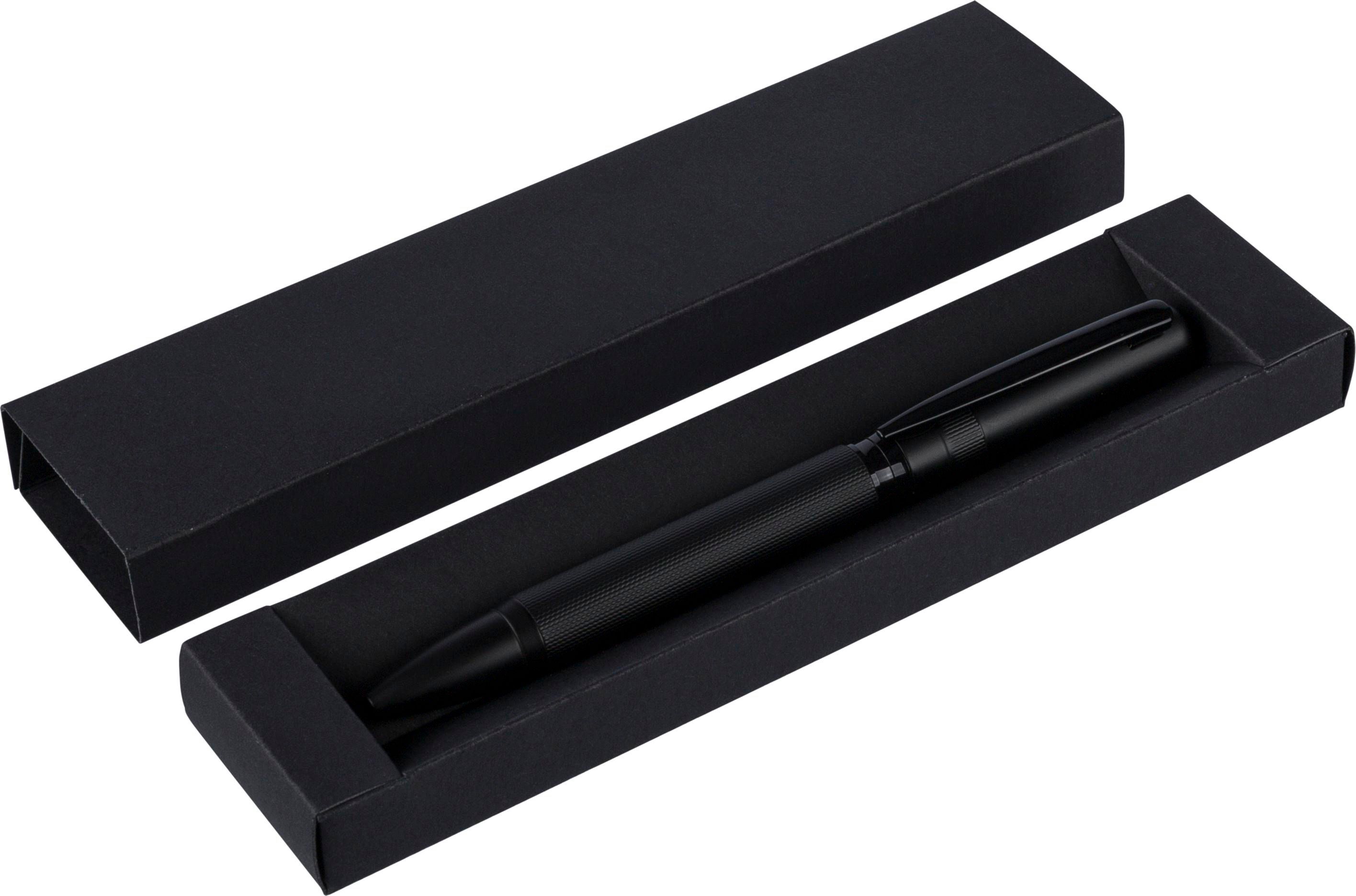 Ecobrass-Drehkugelschreiber mit farblich passendem Metallclip und Drehmechanik. Ausgestattet mit deutscher Dokumentenmine in Blau und einer ungefähren Schreiblänge von 1.000 Metern. Einzeln verpackt in einer schwarzen Schiebeverpackung.