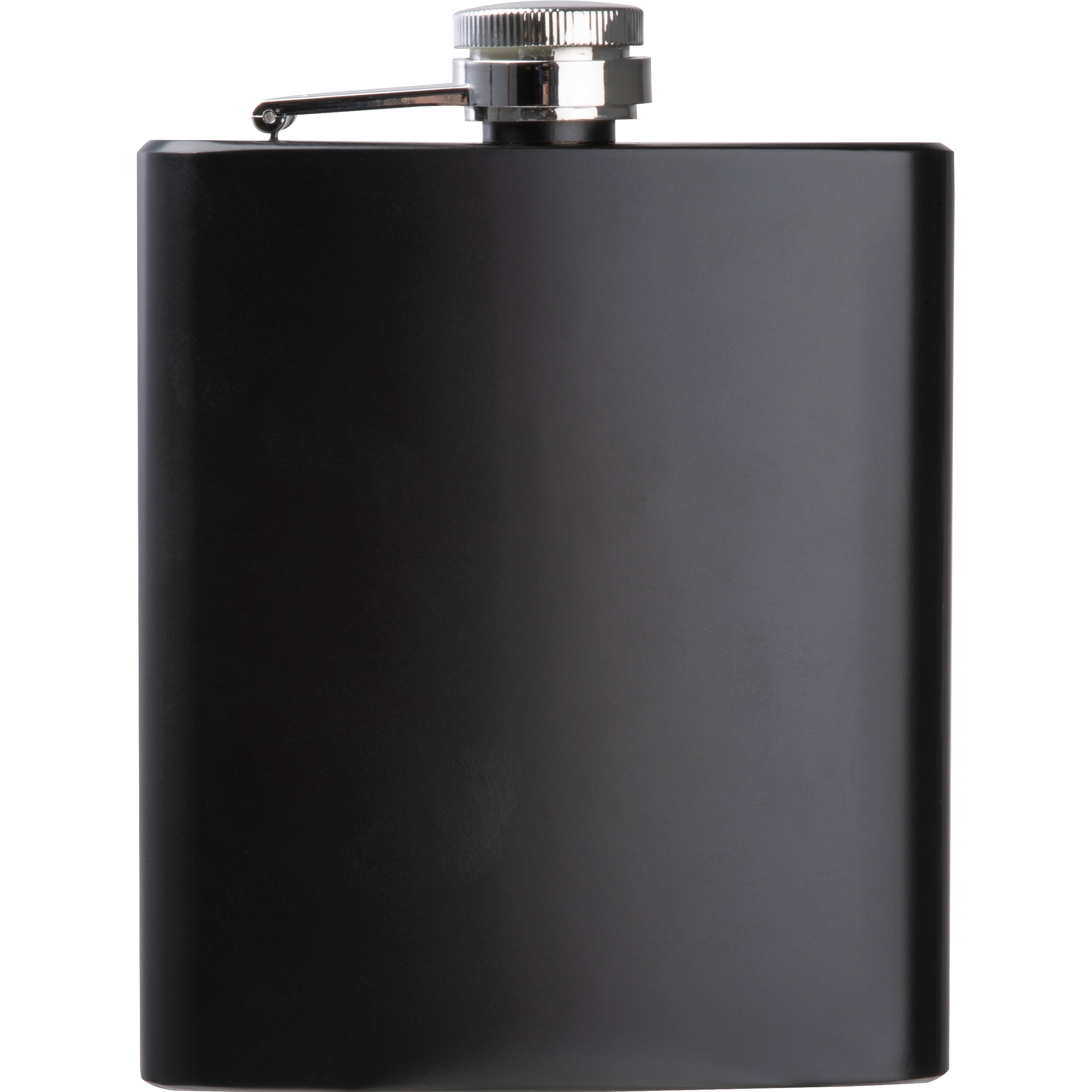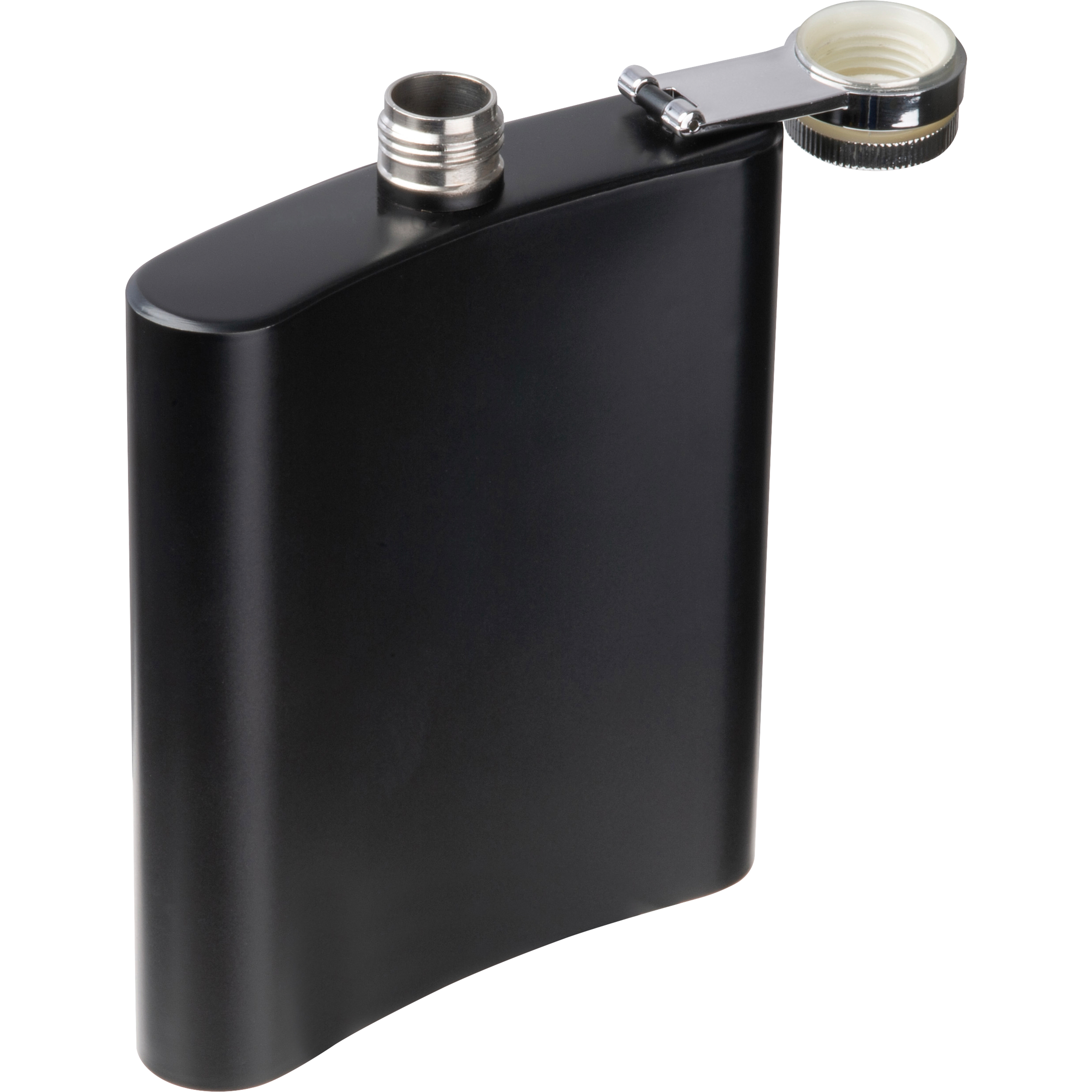 Eleganter Flachmann aus Edelstahl, in mattschwarzem Design und einer Kapazität von 207ml. Perfekt für unterwegs oder als stilvolles Geschenk. Ihr Logo wird mittig auf dem Flachmann platziert.