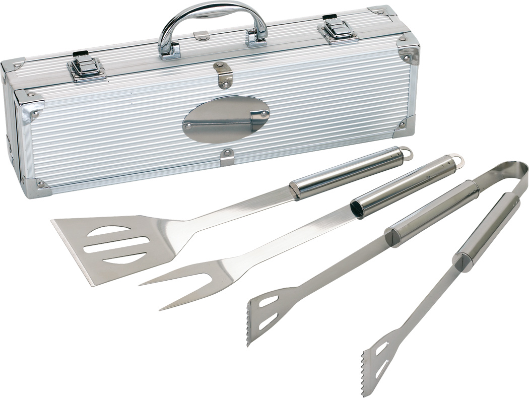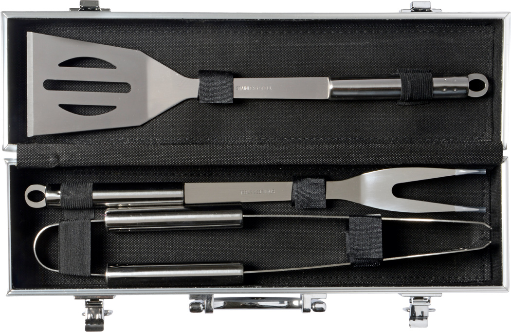 Edelstahl-Grillbesteck ROAST: bestehend aus Bratenwender, Fleischgabel und Grillzange, im silberfarbenen Koffer mit Tragegriff und Scharnierverschlüssen, in Box