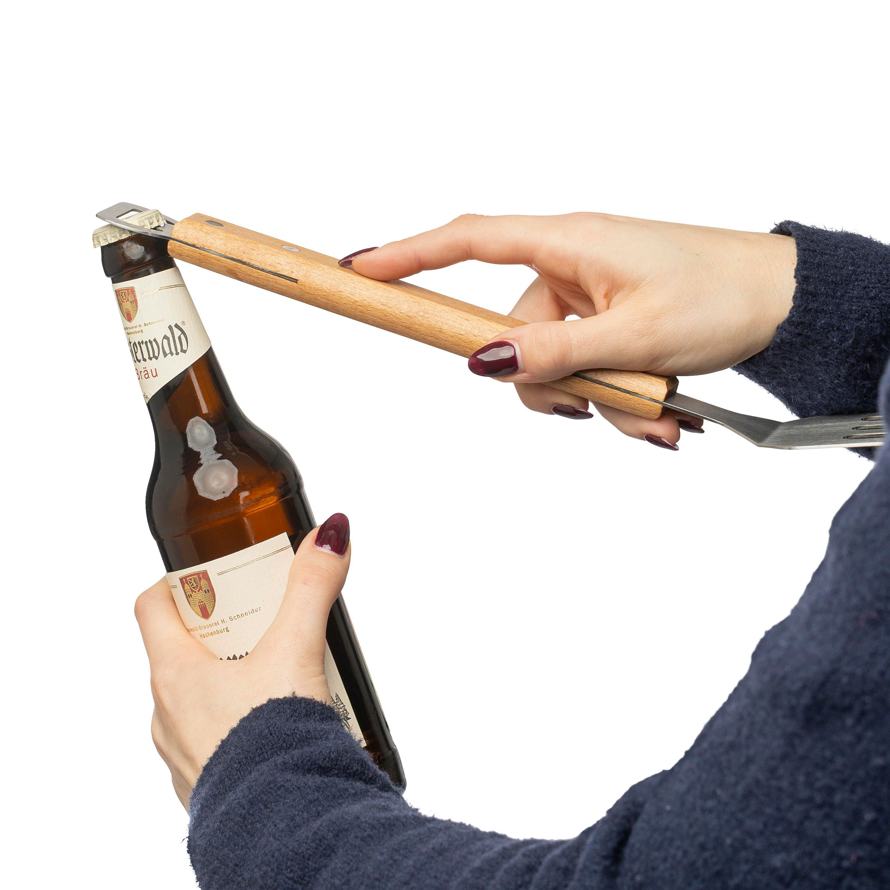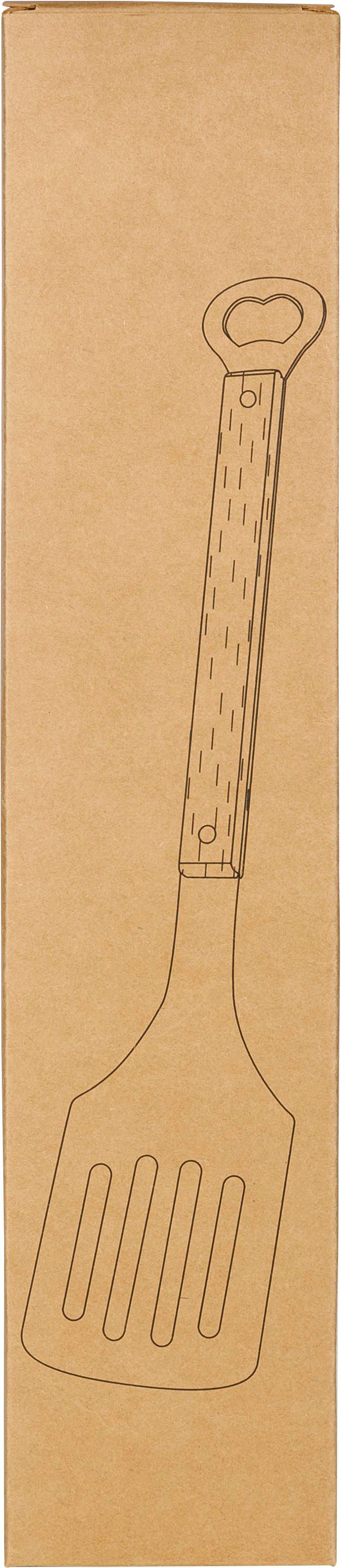 Der Grillspatel ist aus Edelstahl gefertigt und verfügt über einen Buchenholzgriff sowie einen integrierten Flaschenöffner. Er ist einzeln in einem braunen Karton verpackt.