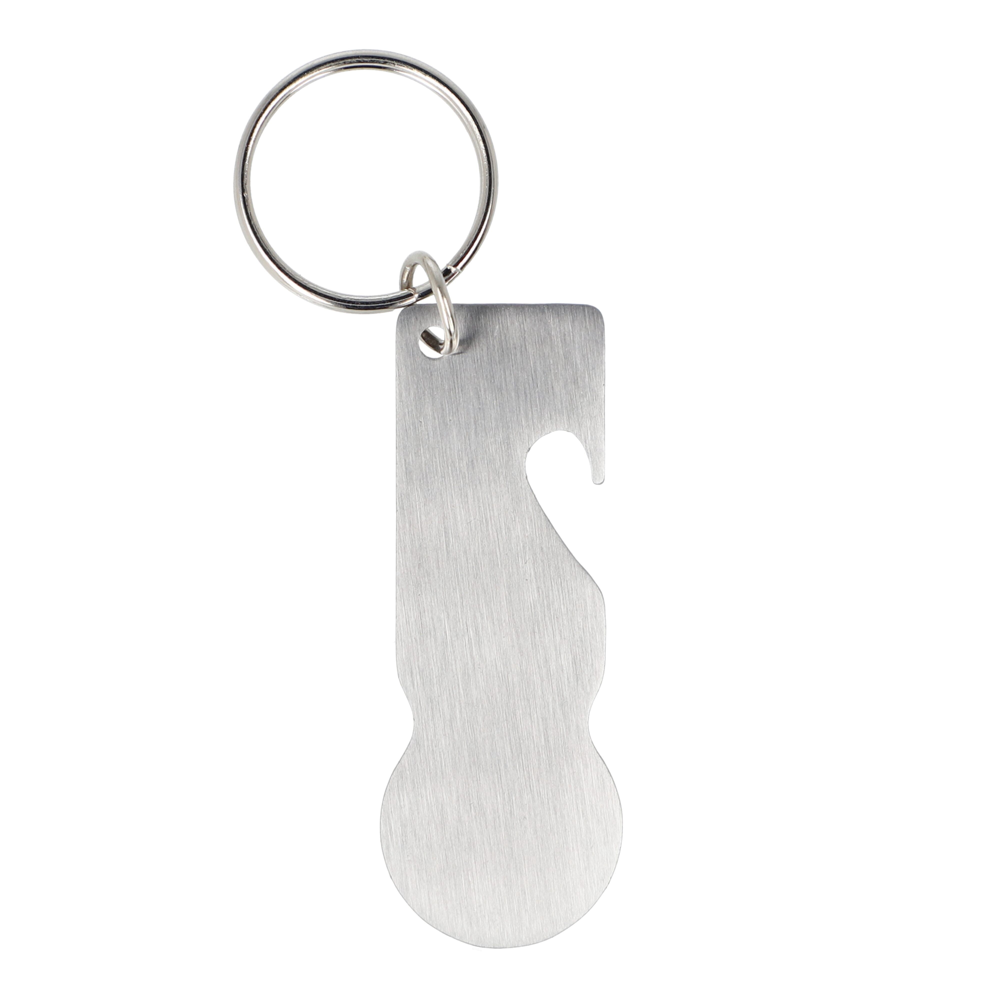 Schlüsselanhänger aus Edelstahl mit integriertem Flaschenöffner und Einkaufswagenlöser, kompatibel mit den meisten westeuropäischen Einkaufswagen. 23 mm Münzkopf. Praktisches Design mit viel Platz für das Branding.