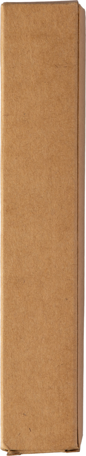 Drehkugelschreiber aus Edelstahl mit Bambusgriff in einer Verpackung aus Bambus und Aluminium. Mit Großraum-Mine. Einzeln verpackt in brauner Pappschachtel.